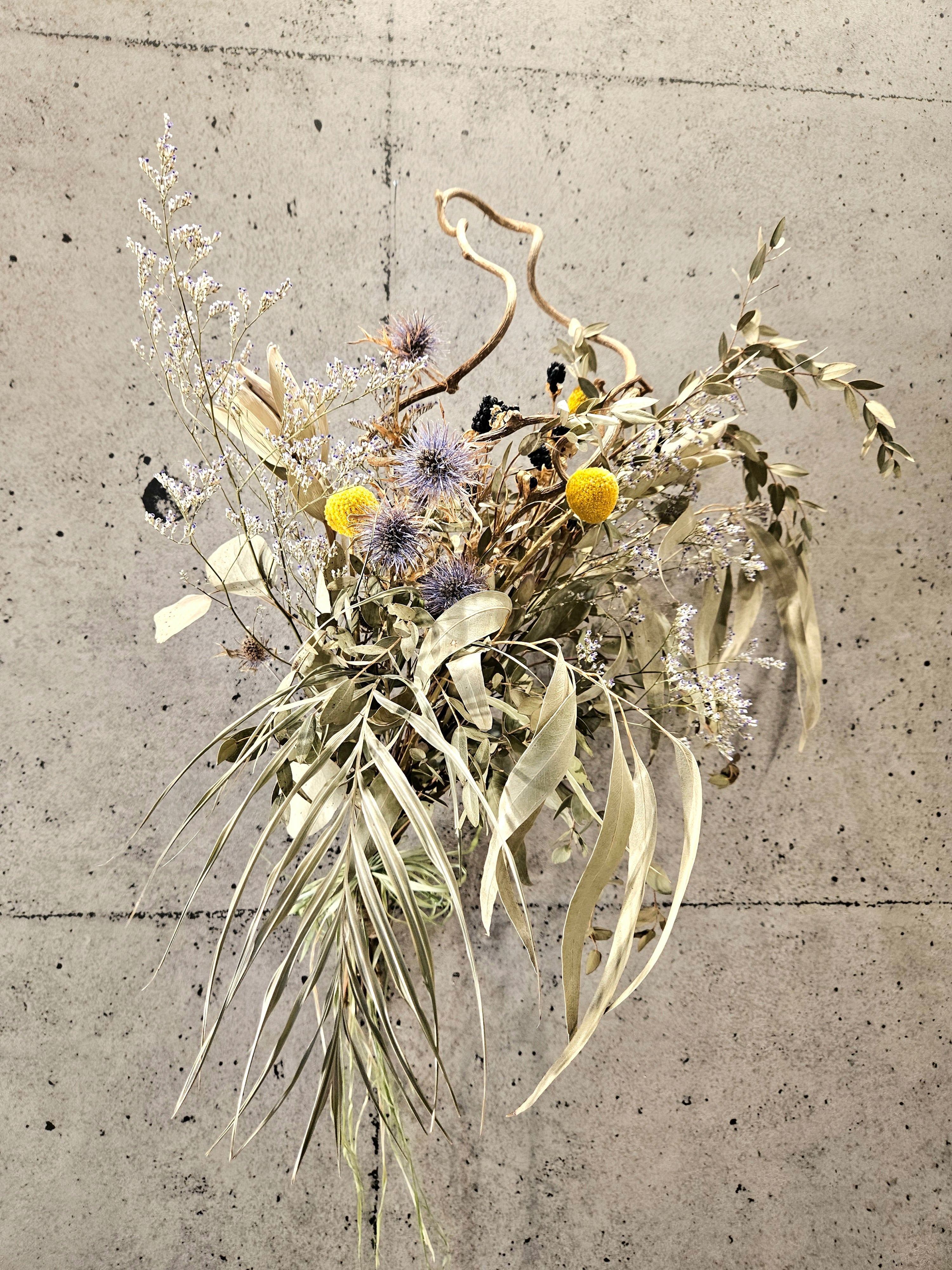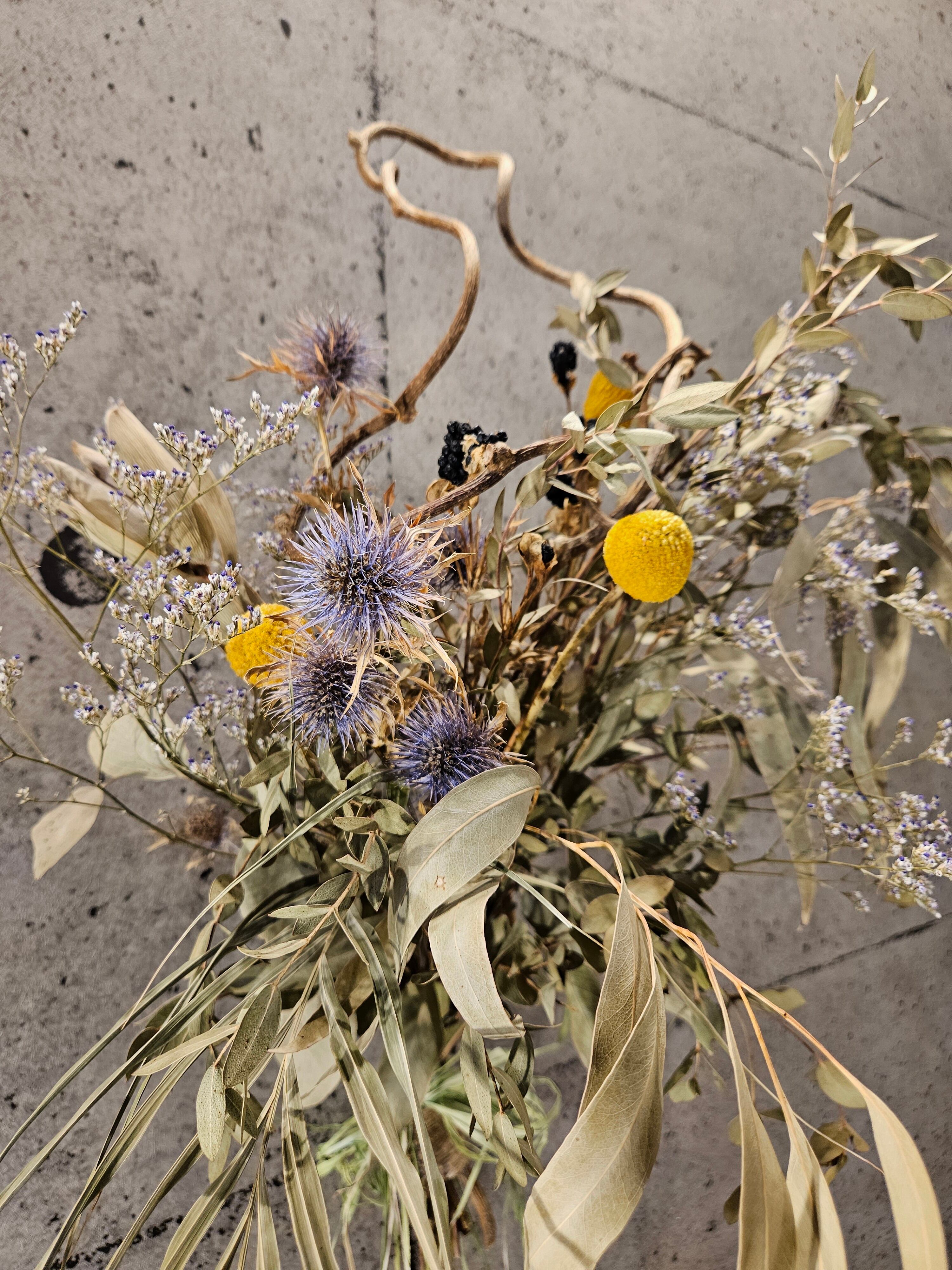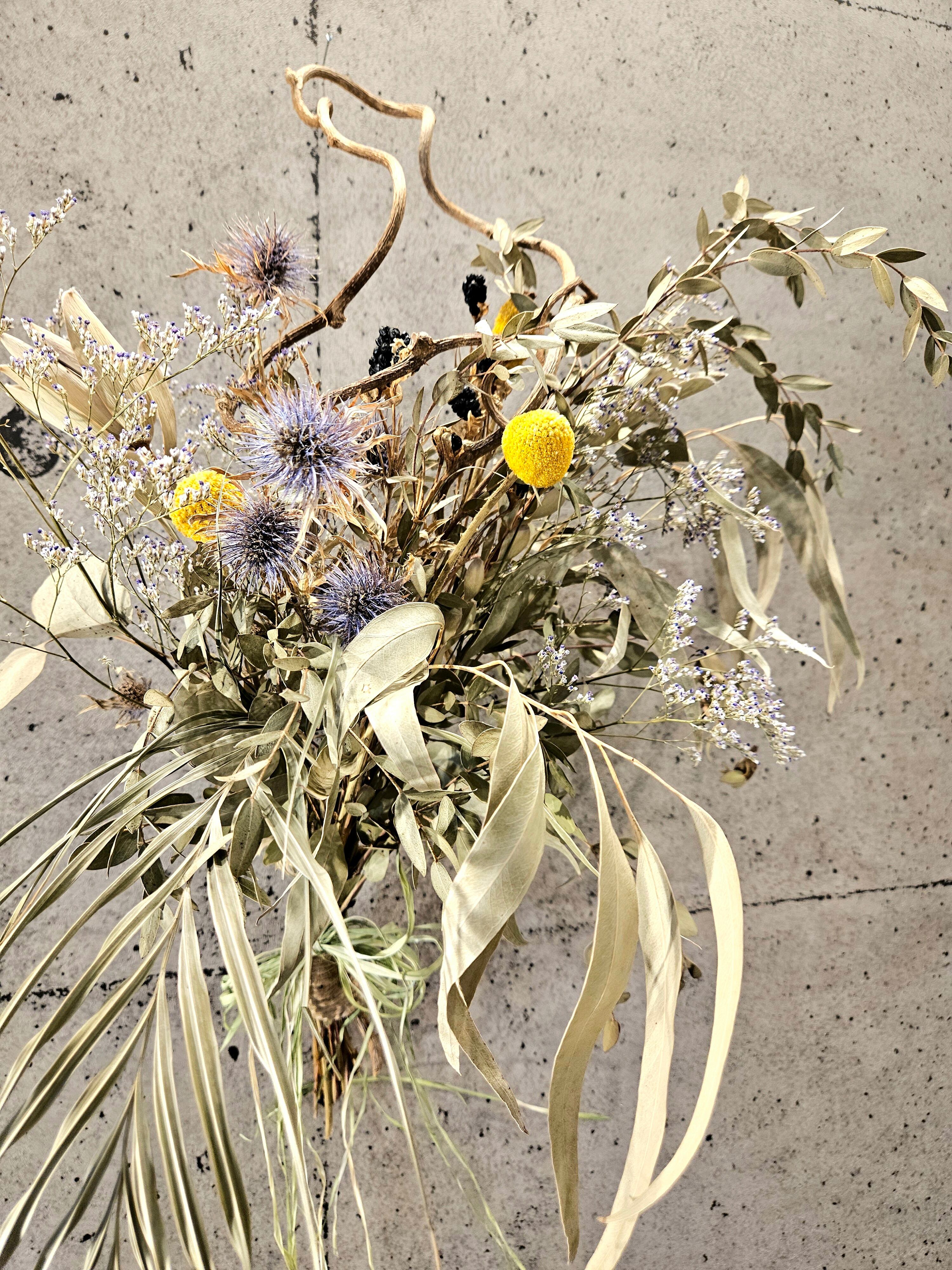 花材ーグラスペディア、リュウカデンドロン、キウイのツル、ユウカリ、ヒオウギの実、スターチス、エリンジウム等のドライフラワーを組み合わせ作製致しました。