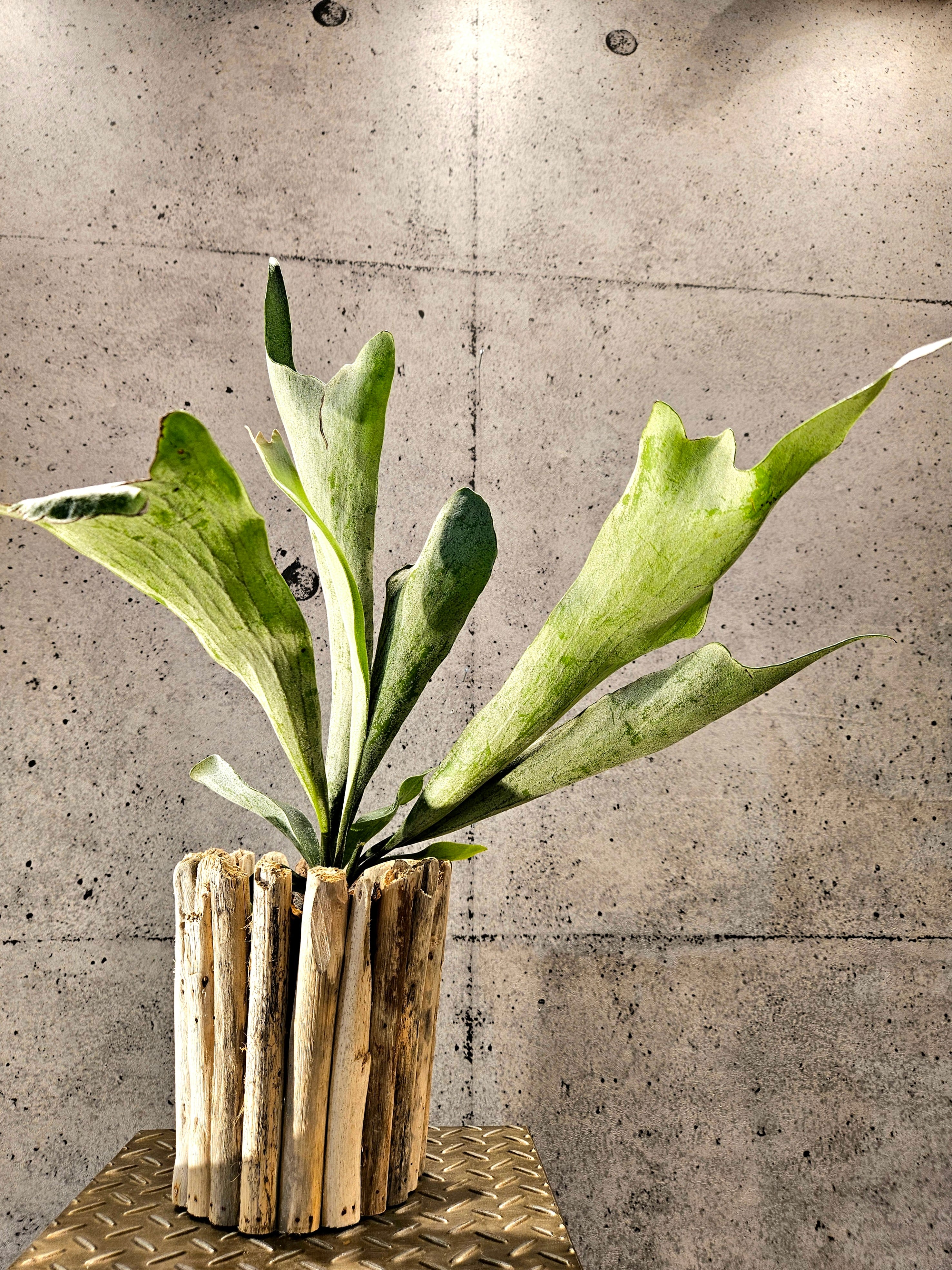 自然の造形を活かした流木風のウッドポットに、個性的なフォルムが人気のビカクシダ(コウモリラン)を組み合わせました。まるでオブジェのような佇まいのビカクシダと、一つ一つ表情の異なるウッドポットはお部屋にナチュラルでありながらも洗練された雰囲気をもたらします。