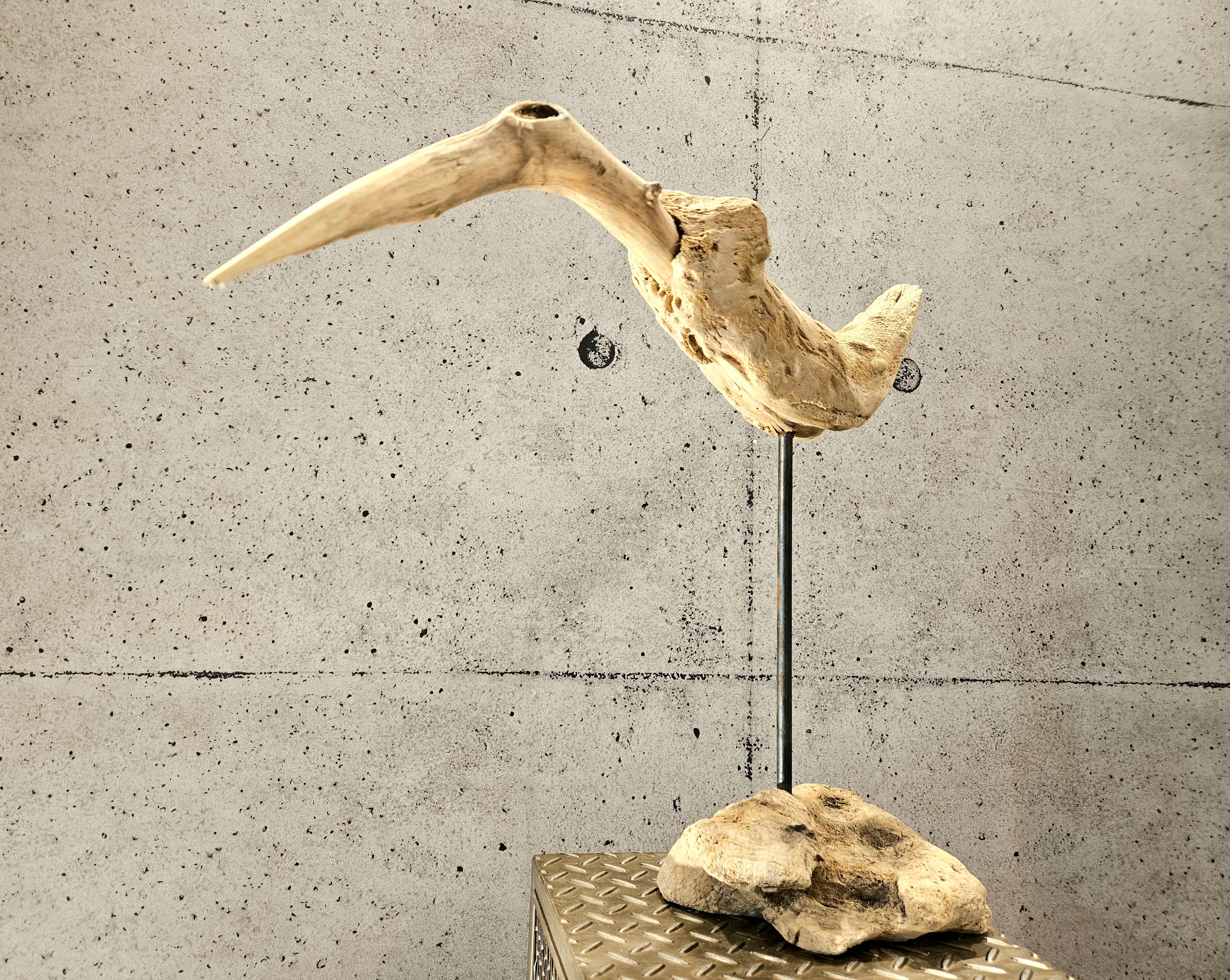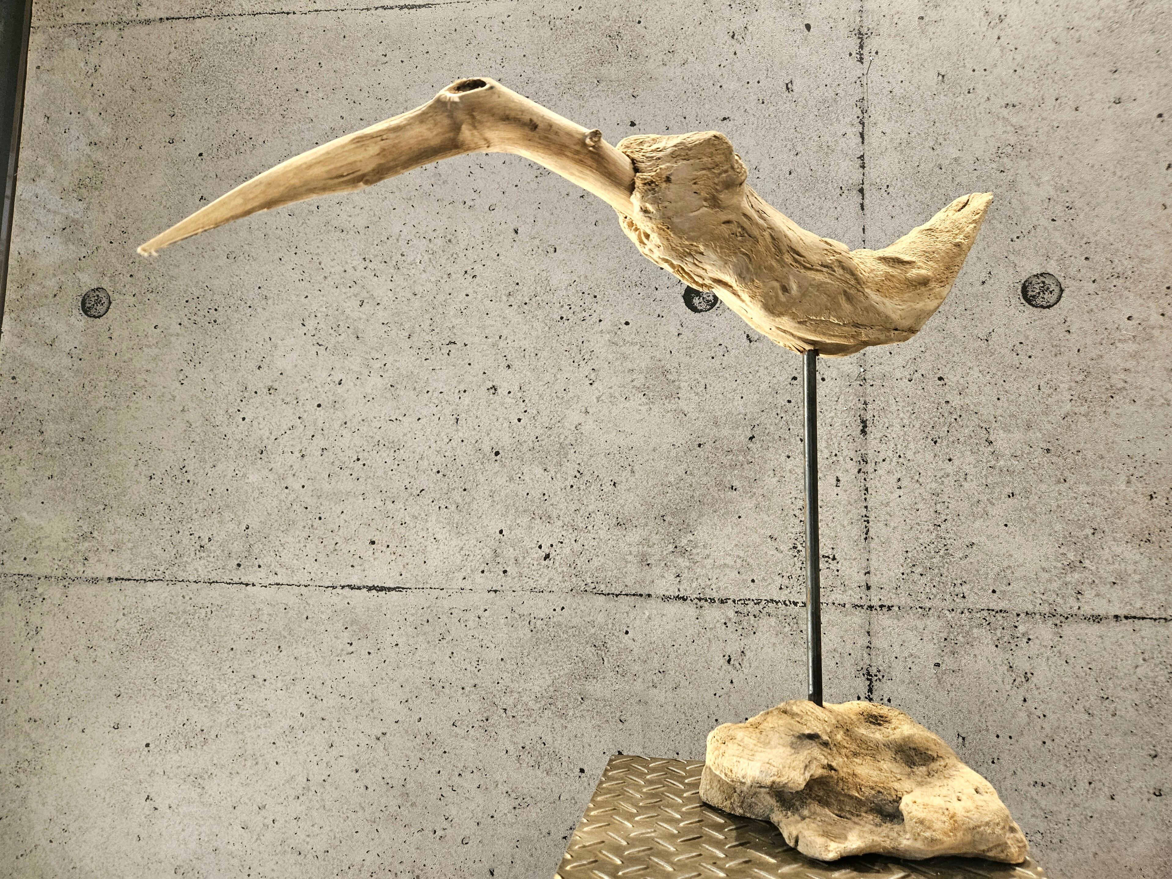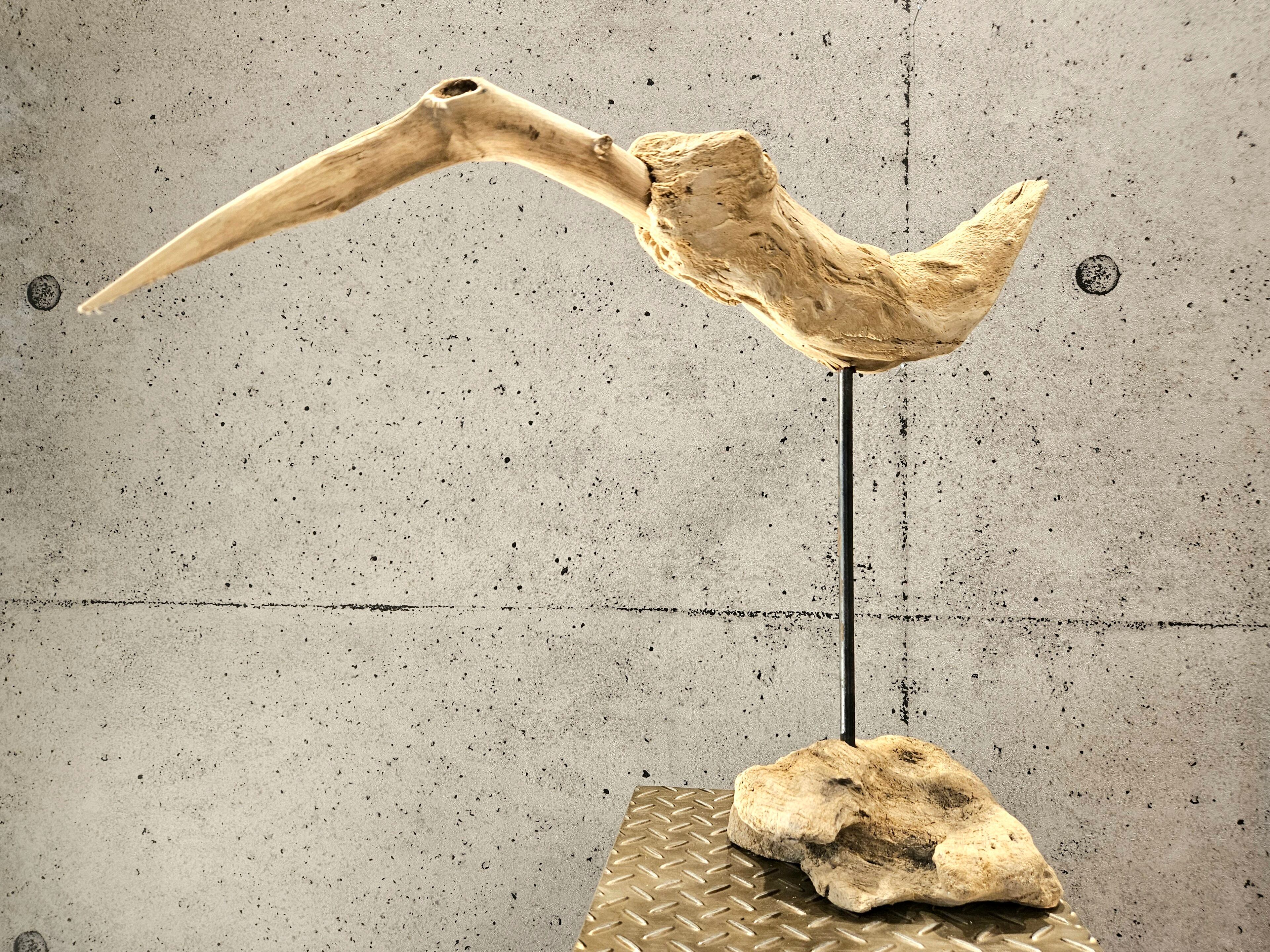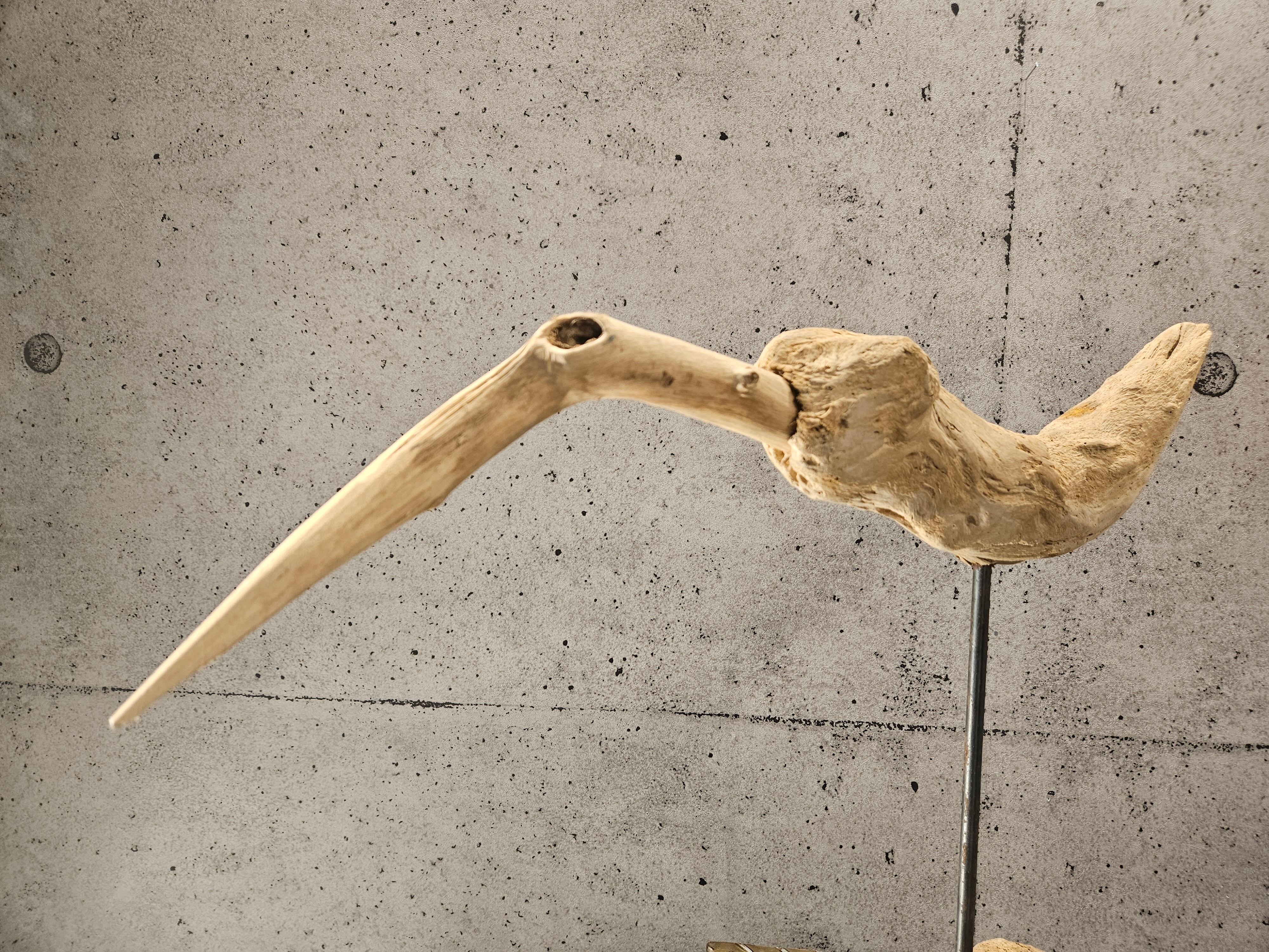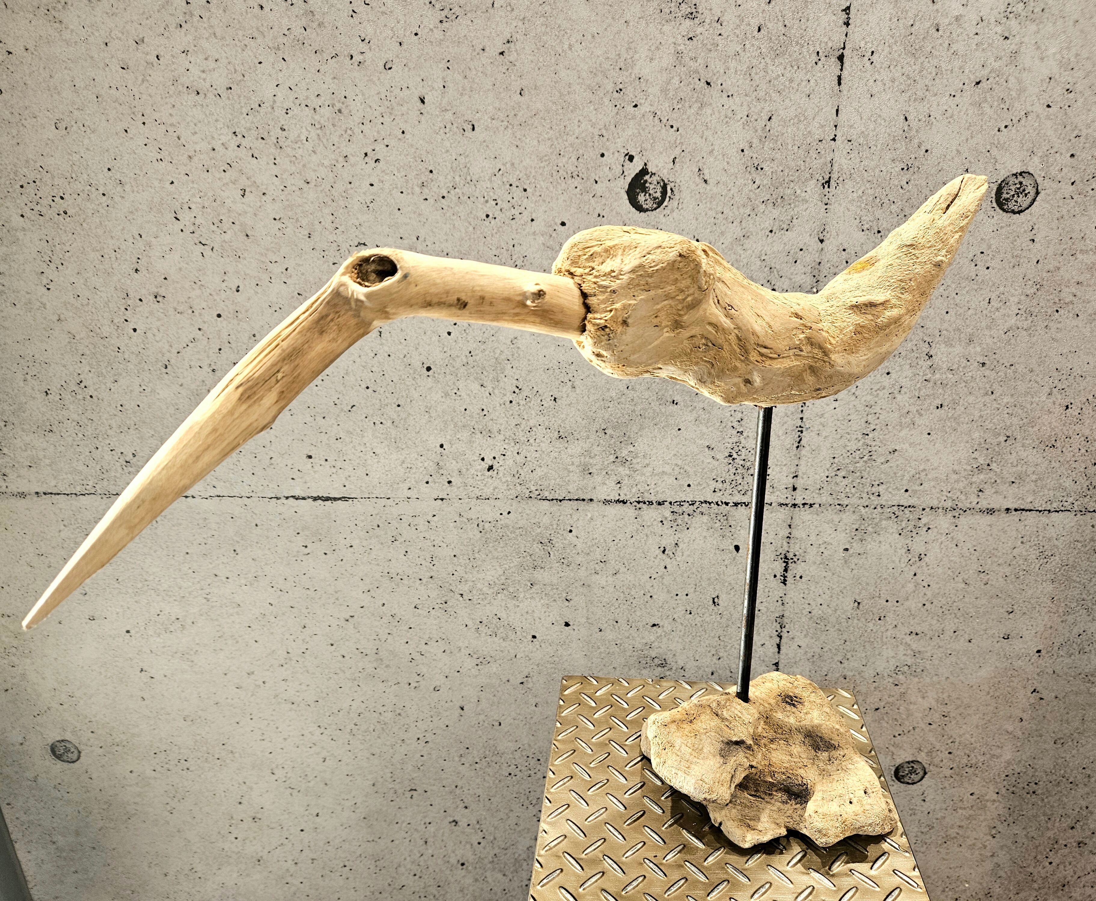 コンクリートの壁を背景に、独特の存在感のウッドオブジェです。長い嘴を持つ鳥を思わせるフォルムは、自然が作り出した造形美と、朽ちたような、あるいは風化したような木肌の表情が、静かで奥行きのある空間を演出します。無機質な空間にも、和やかな空間にも、自然の息吹と芸術的なアクセントをもたらします。