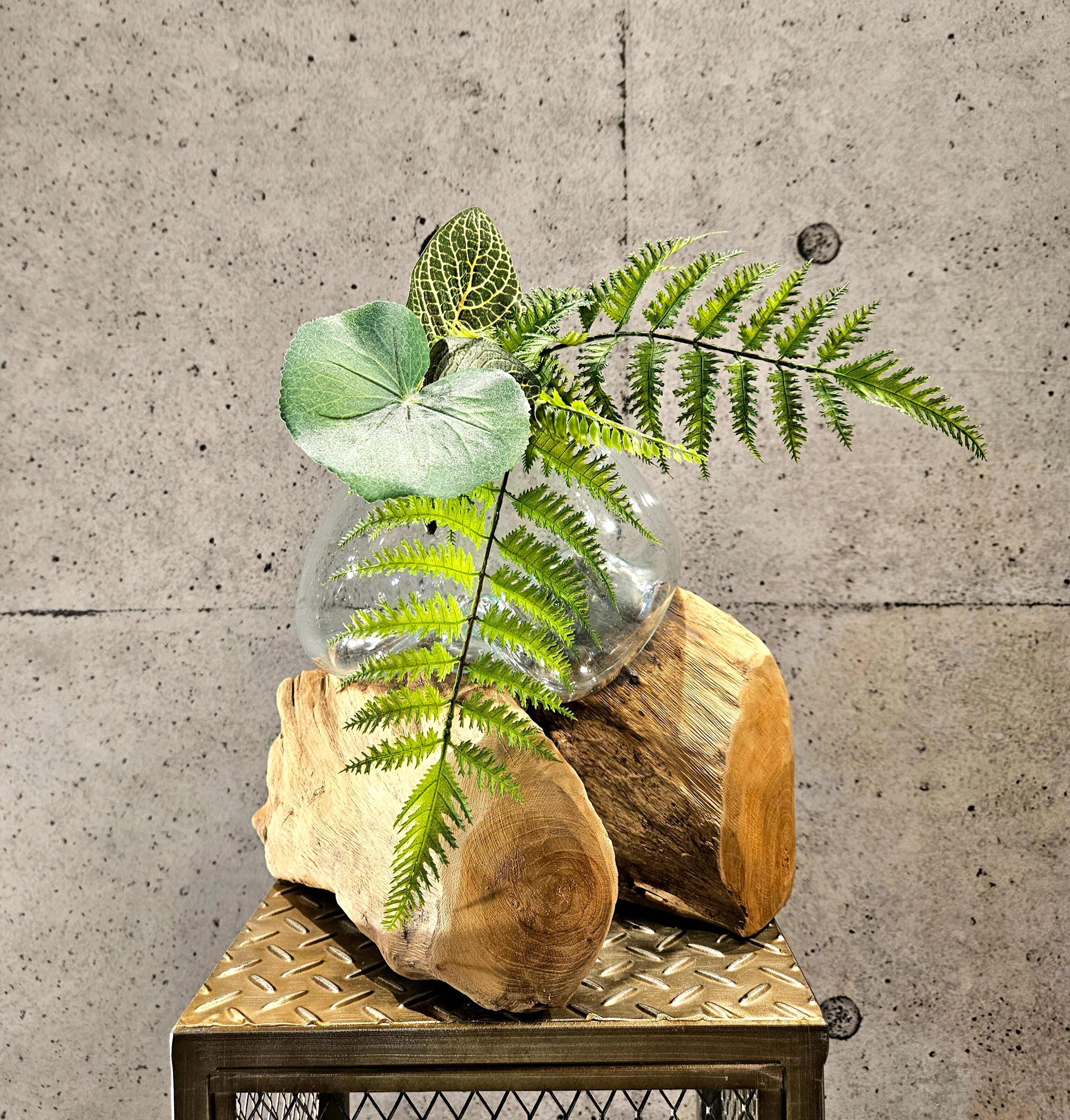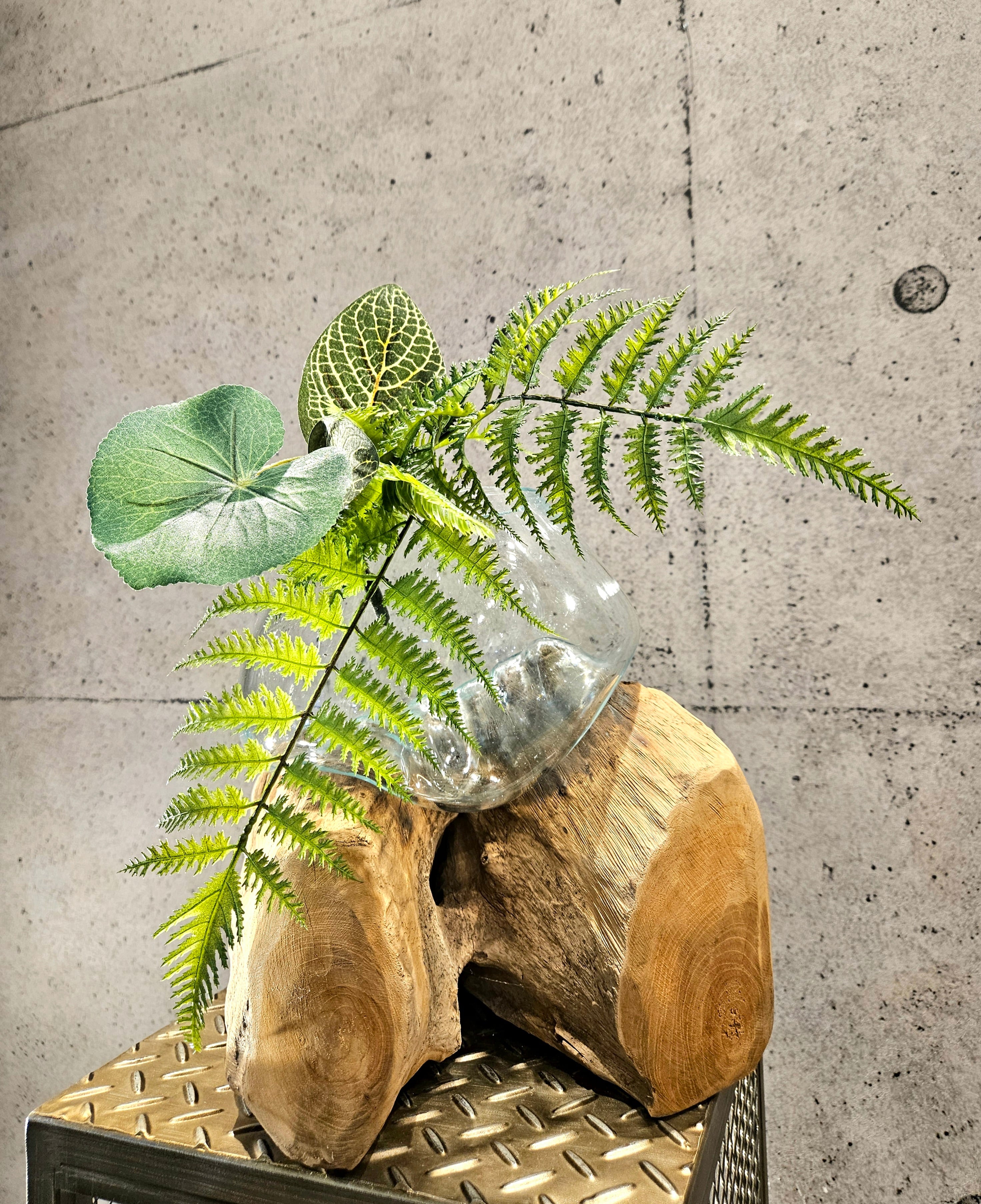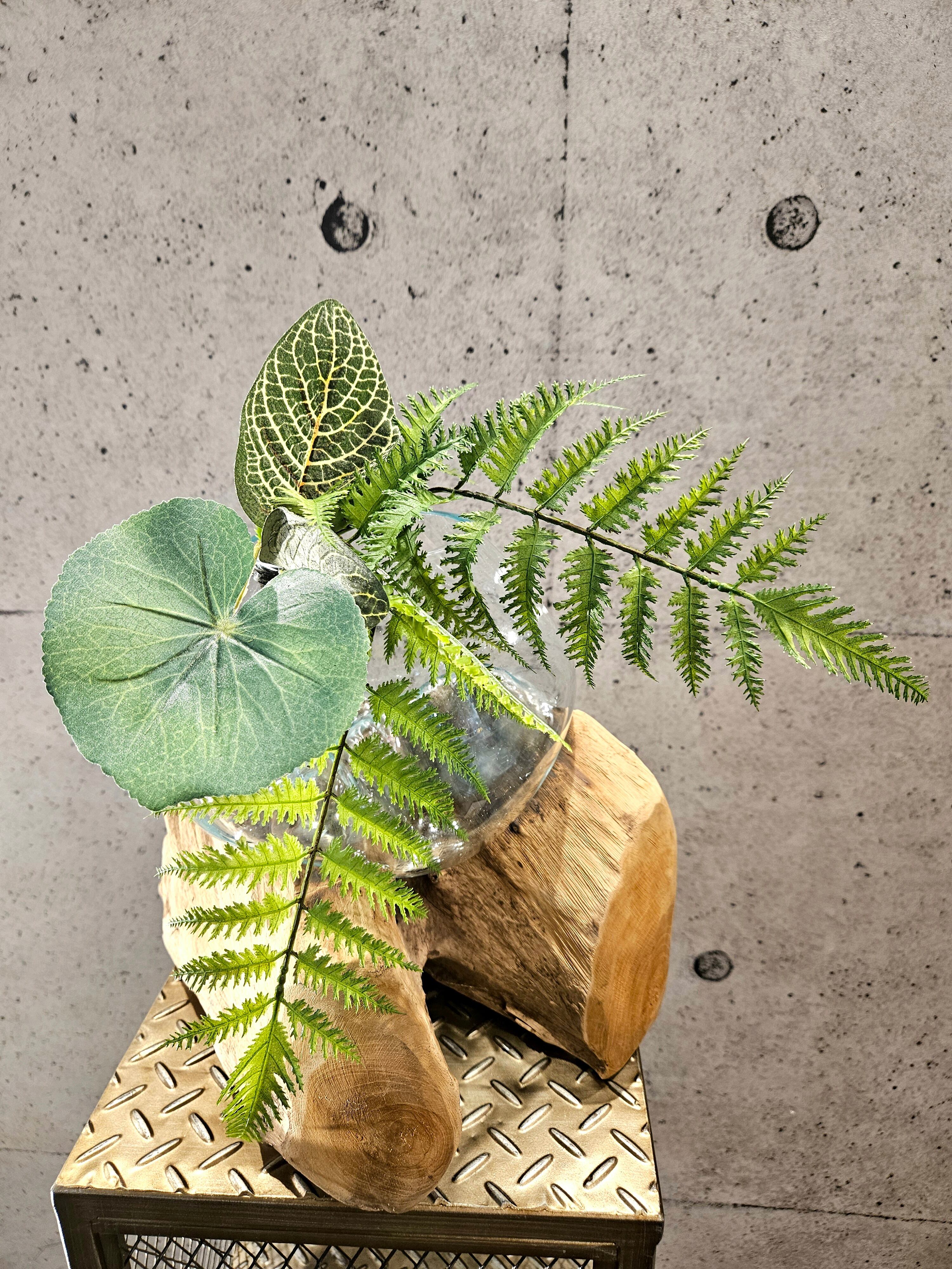 しなやかな曲線を描くシダの葉等、様々なグリーンの表情を見せてくれます。透明感のあるガラス花器は、光を取り込み、周囲の風景を映し出すことで空間に奥行きを与えます。そして、天然木のオブジェは、その重厚感と自然な木目が、全体の調和を高めています。
