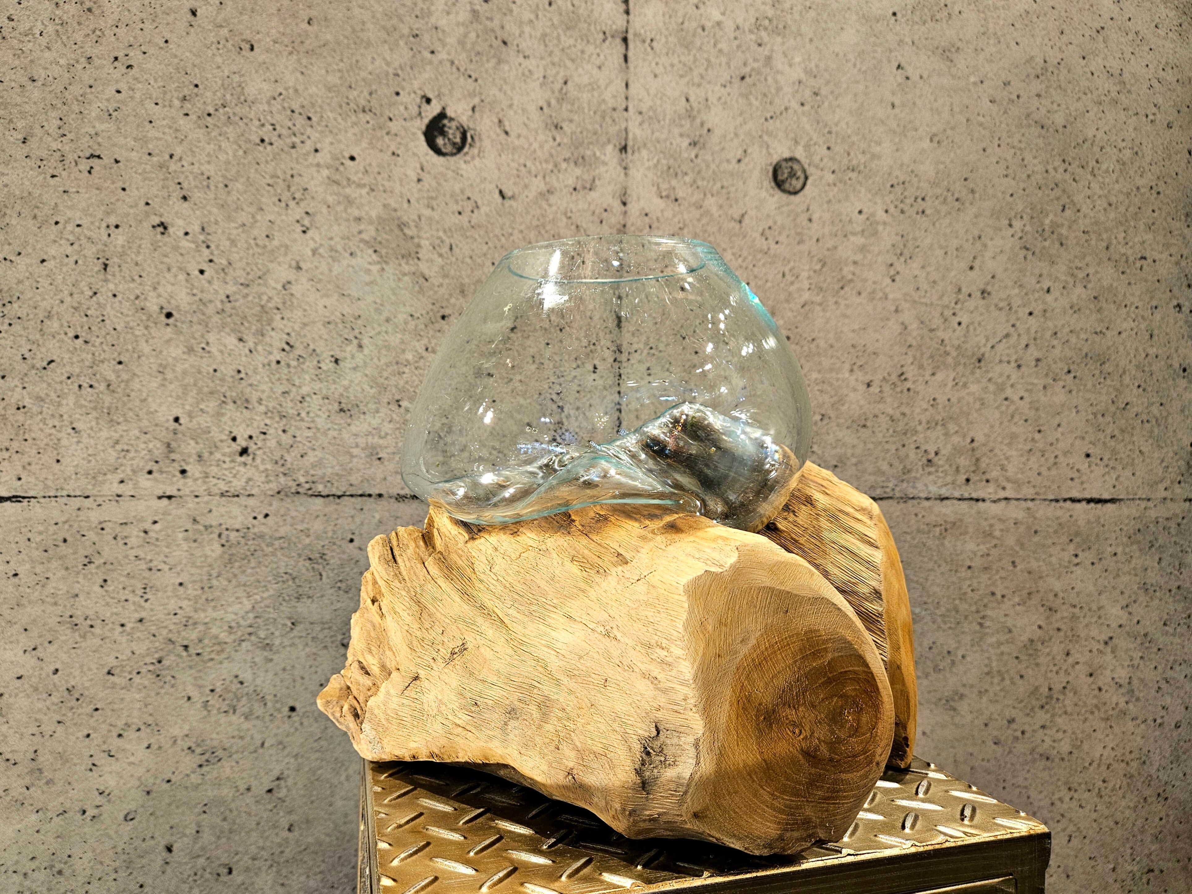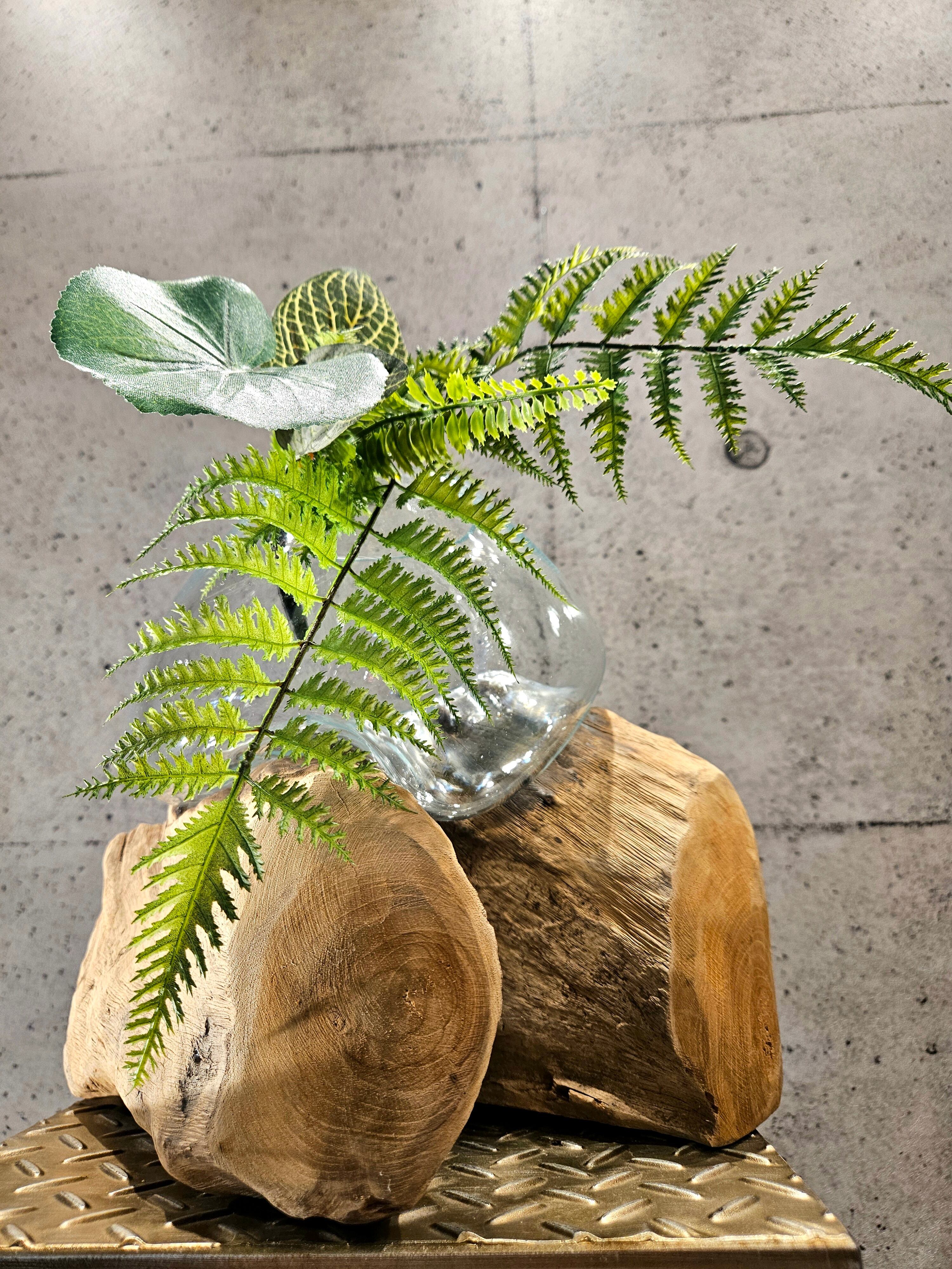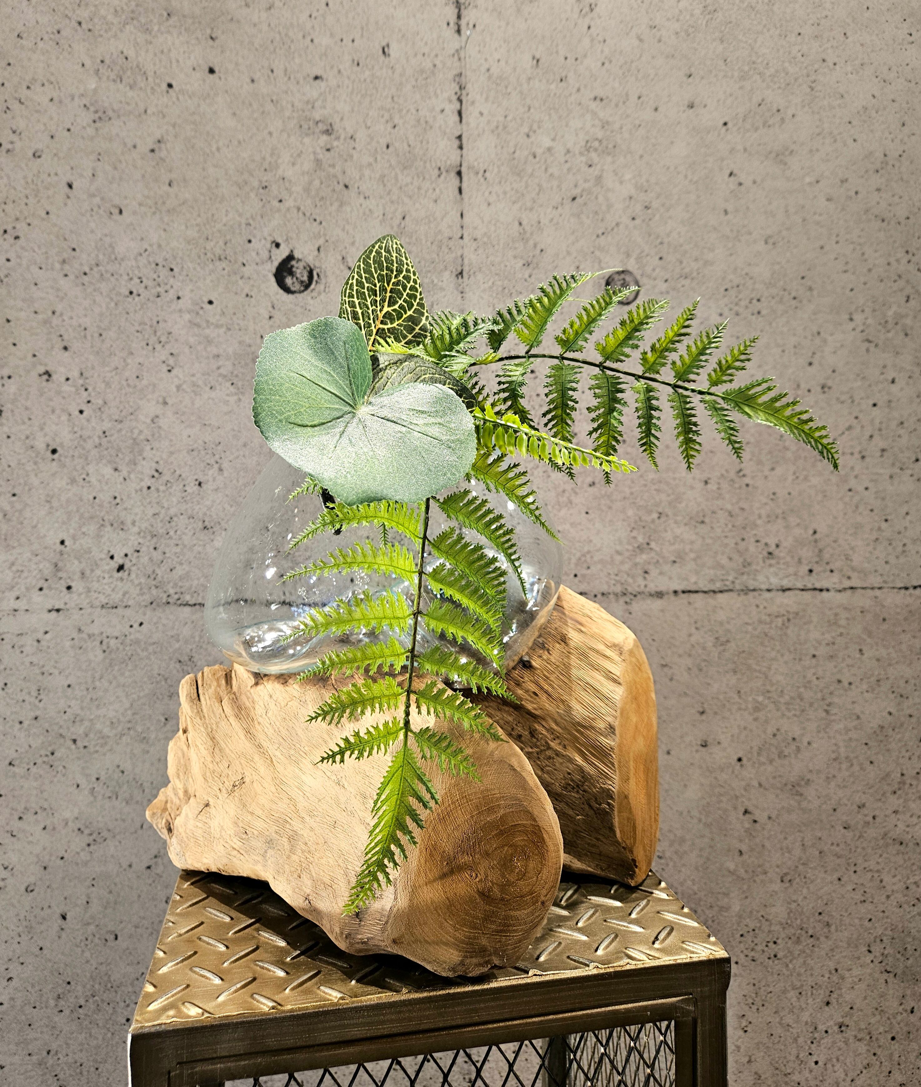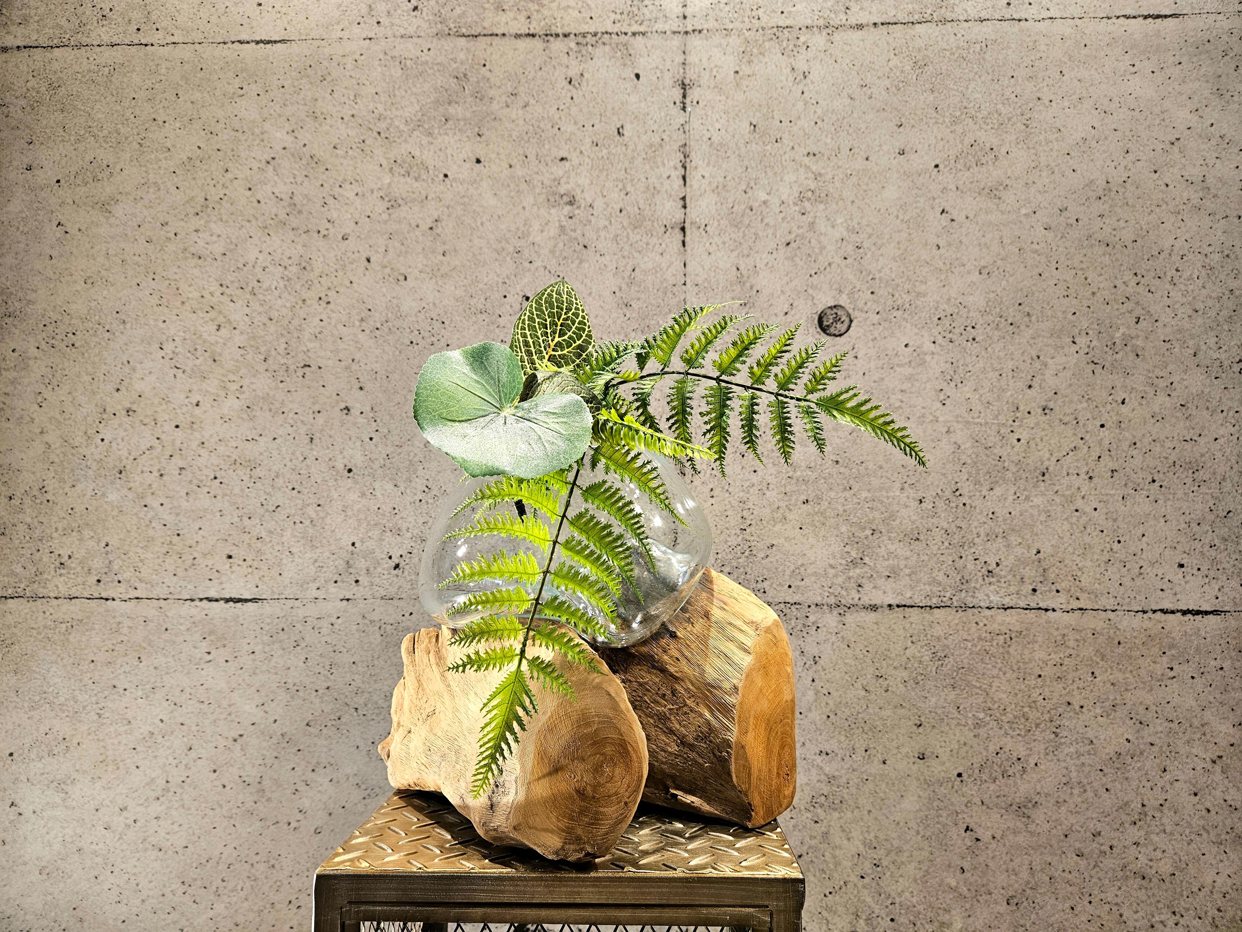 しなやかな曲線を描くシダの葉等、様々なグリーンの表情を見せてくれます。透明感のあるガラス花器は、光を取り込み、周囲の風景を映し出すことで空間に奥行きを与えます。そして、天然木のオブジェは、その重厚感と自然な木目が、全体の調和を高めています。