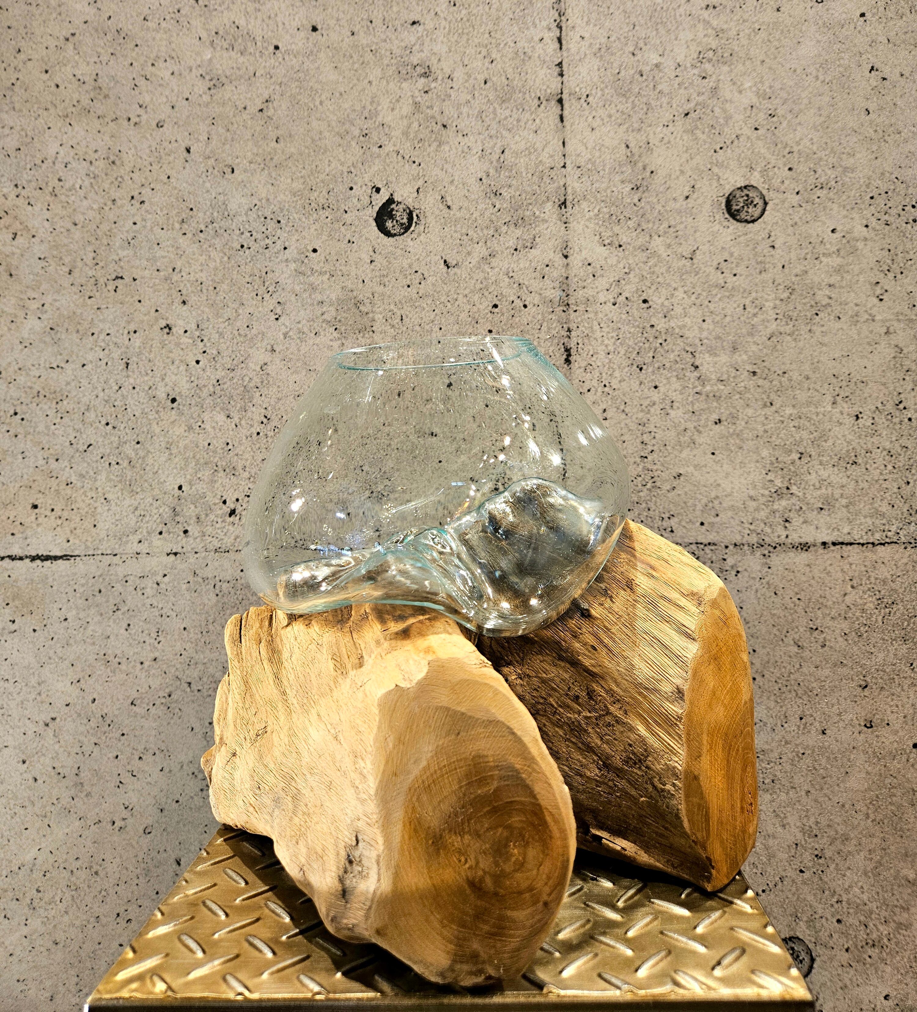 こちらのディスプレイは、生命力あふれるグリーンをリアルに再現した高品質なアーティフィシャルフラワー(造花)と、丸みを帯びたクリアなガラス花器、そして自然の温もりを感じさせる無垢材のオブジェが絶妙なバランスで組み合わされています。