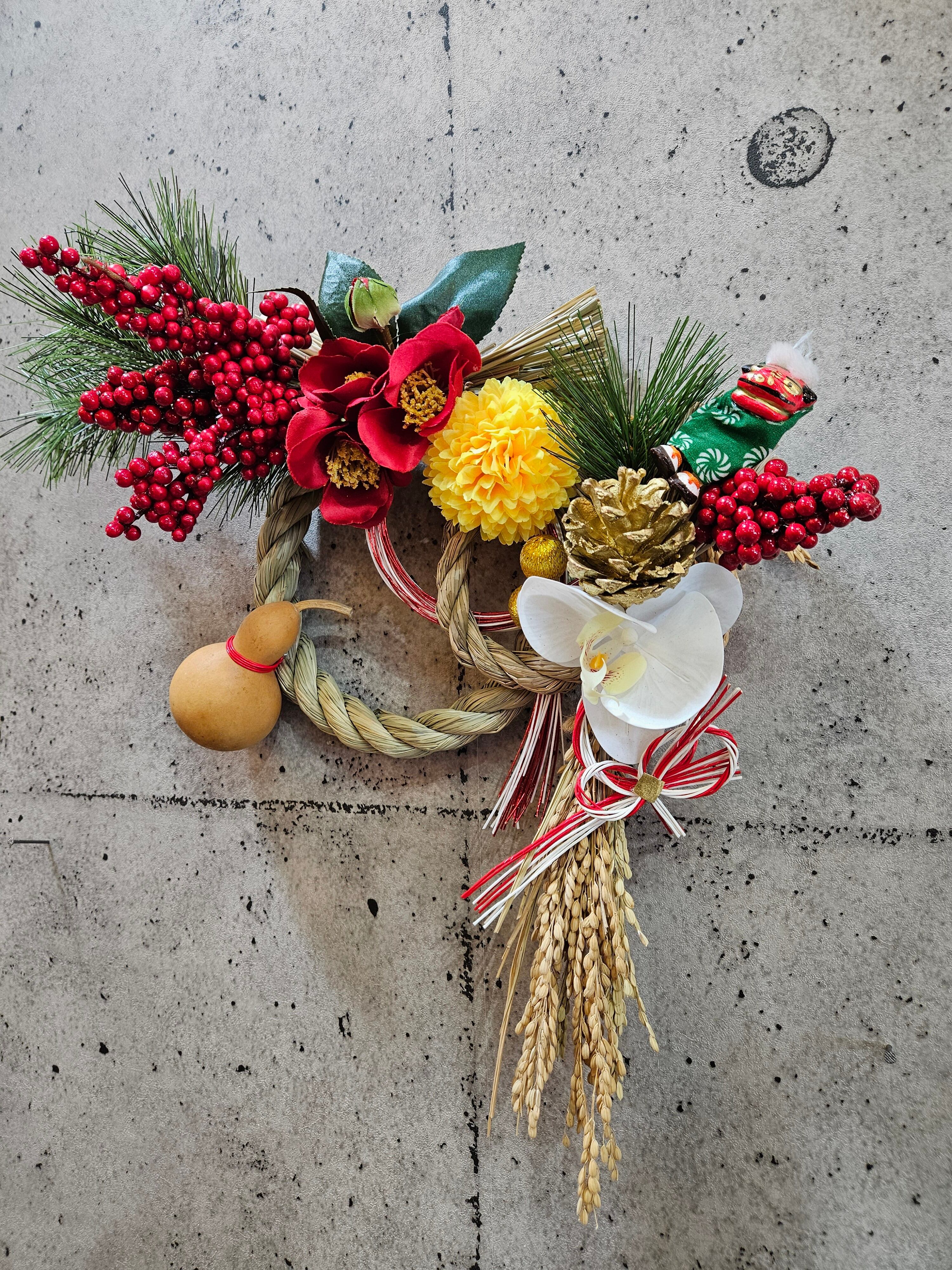 アーティフィシャルフラワー花材ーマツ、ナンテン、ポンポン菊、コチョウラン、ツバキ、獅子舞等