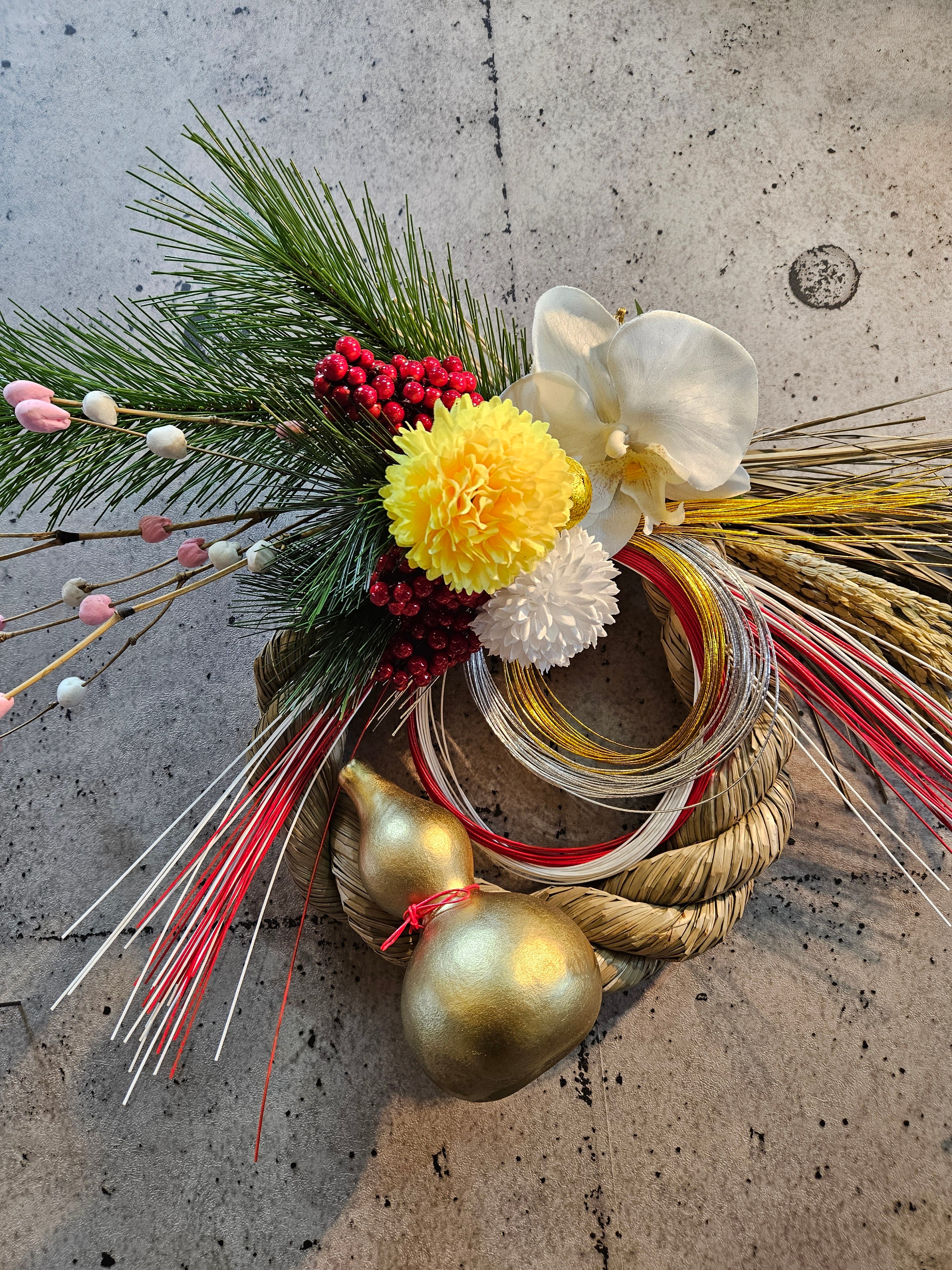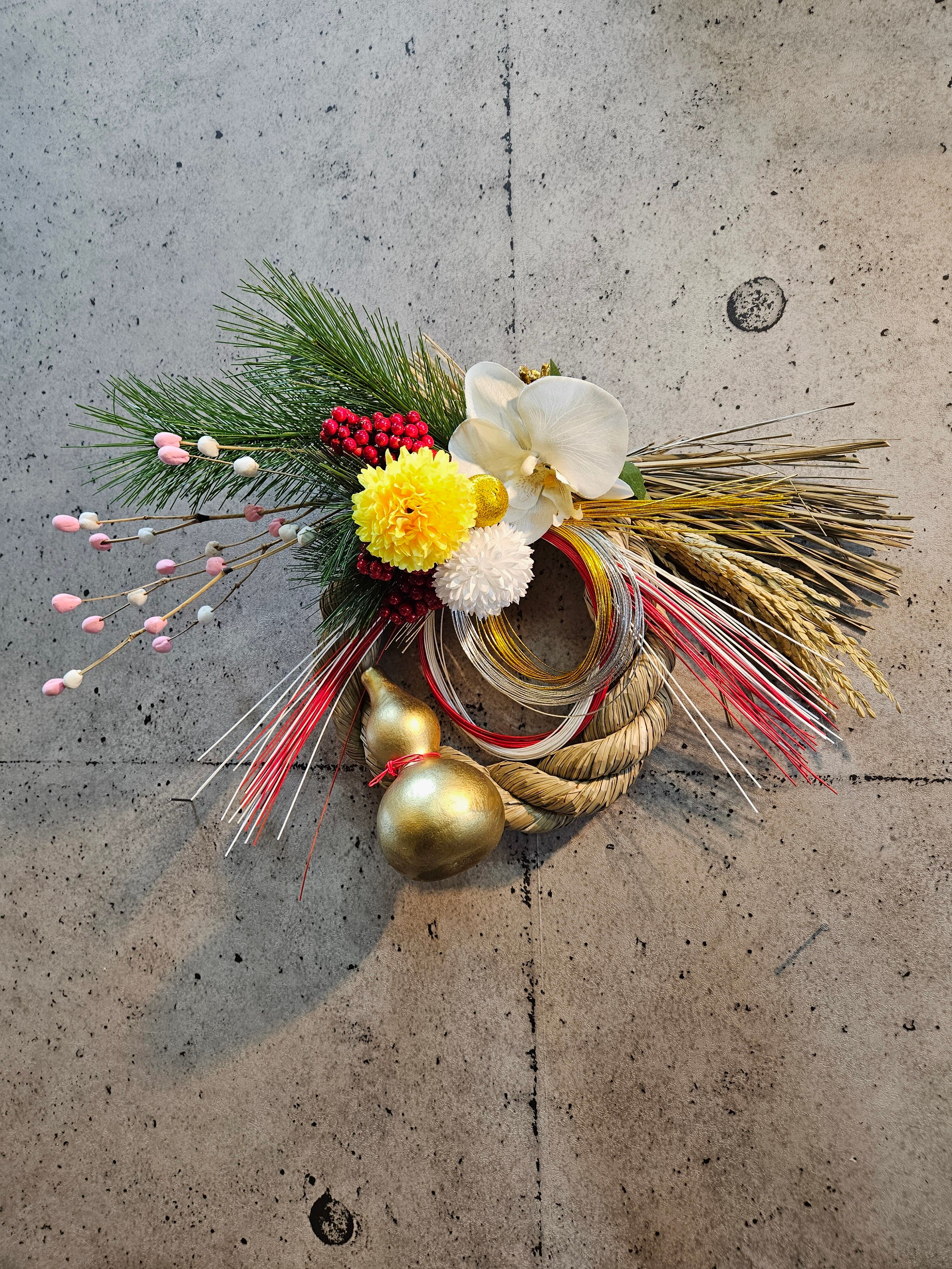 アーティフィシャルフラワー花材ーマツ、ナンテン、ポンポン菊、コチョウラン、餅花等