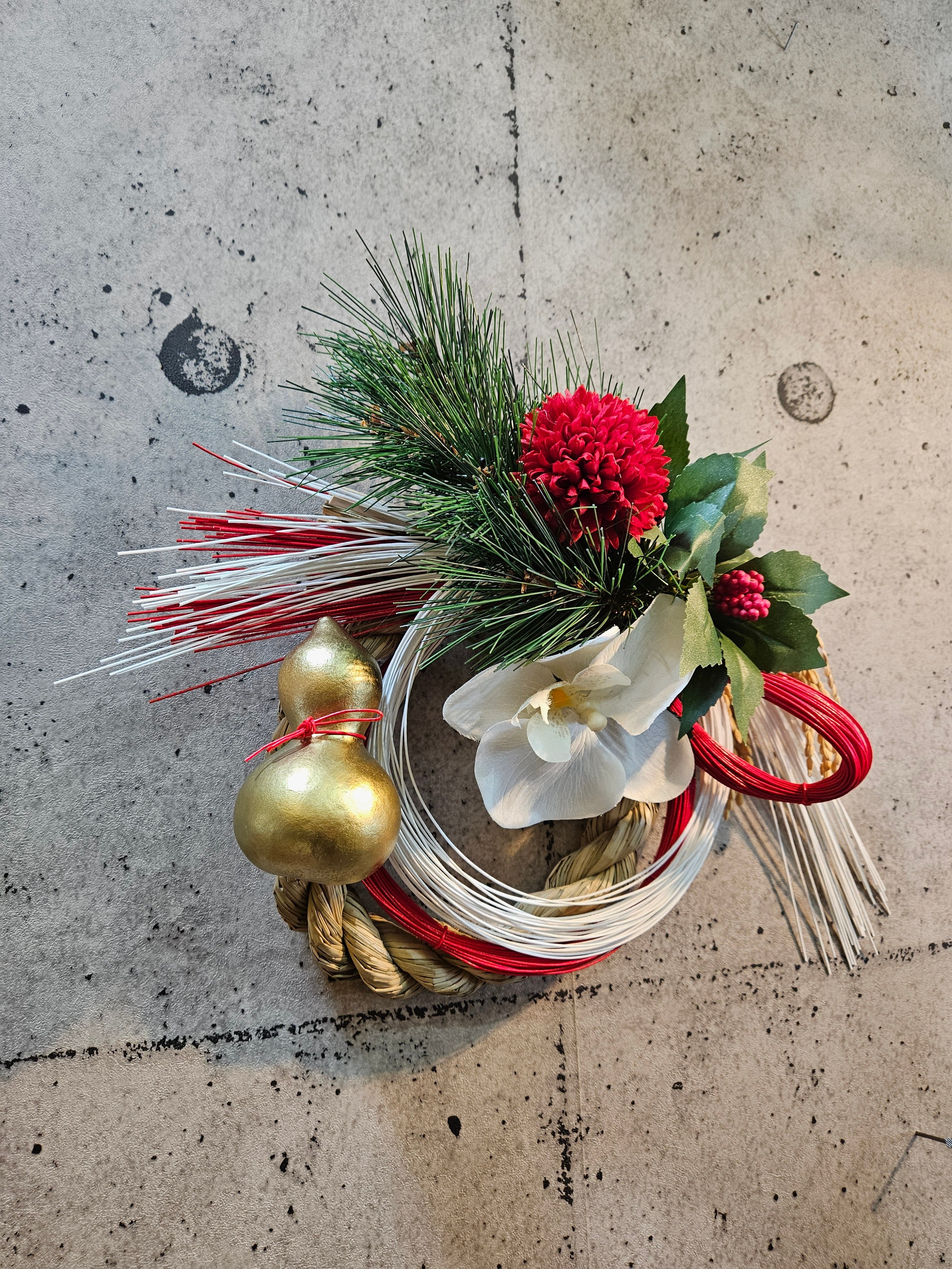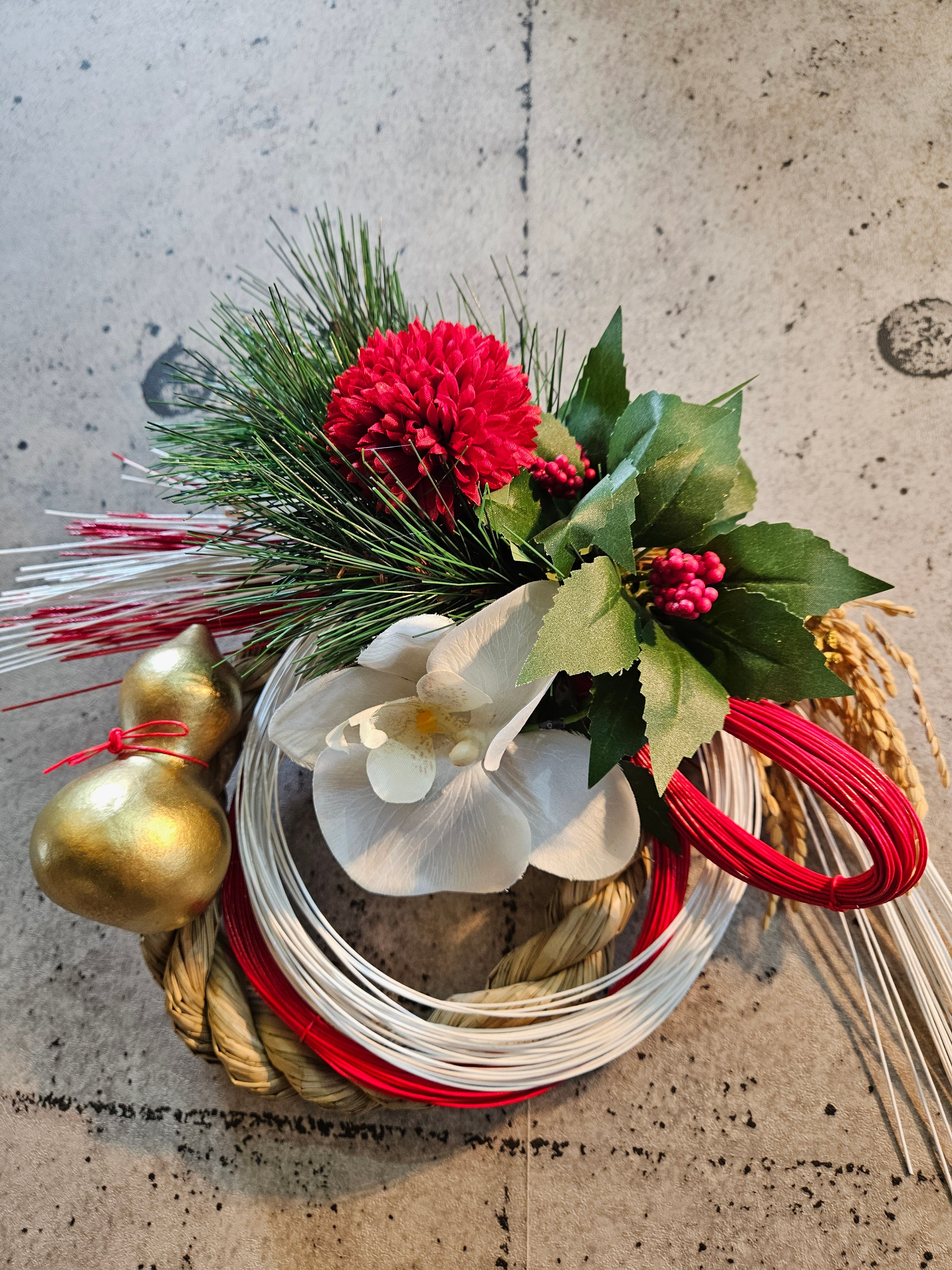 アーティフィシャルフラワー花材ーマツ、センリョウ、ポンポン菊、コチョウラン等