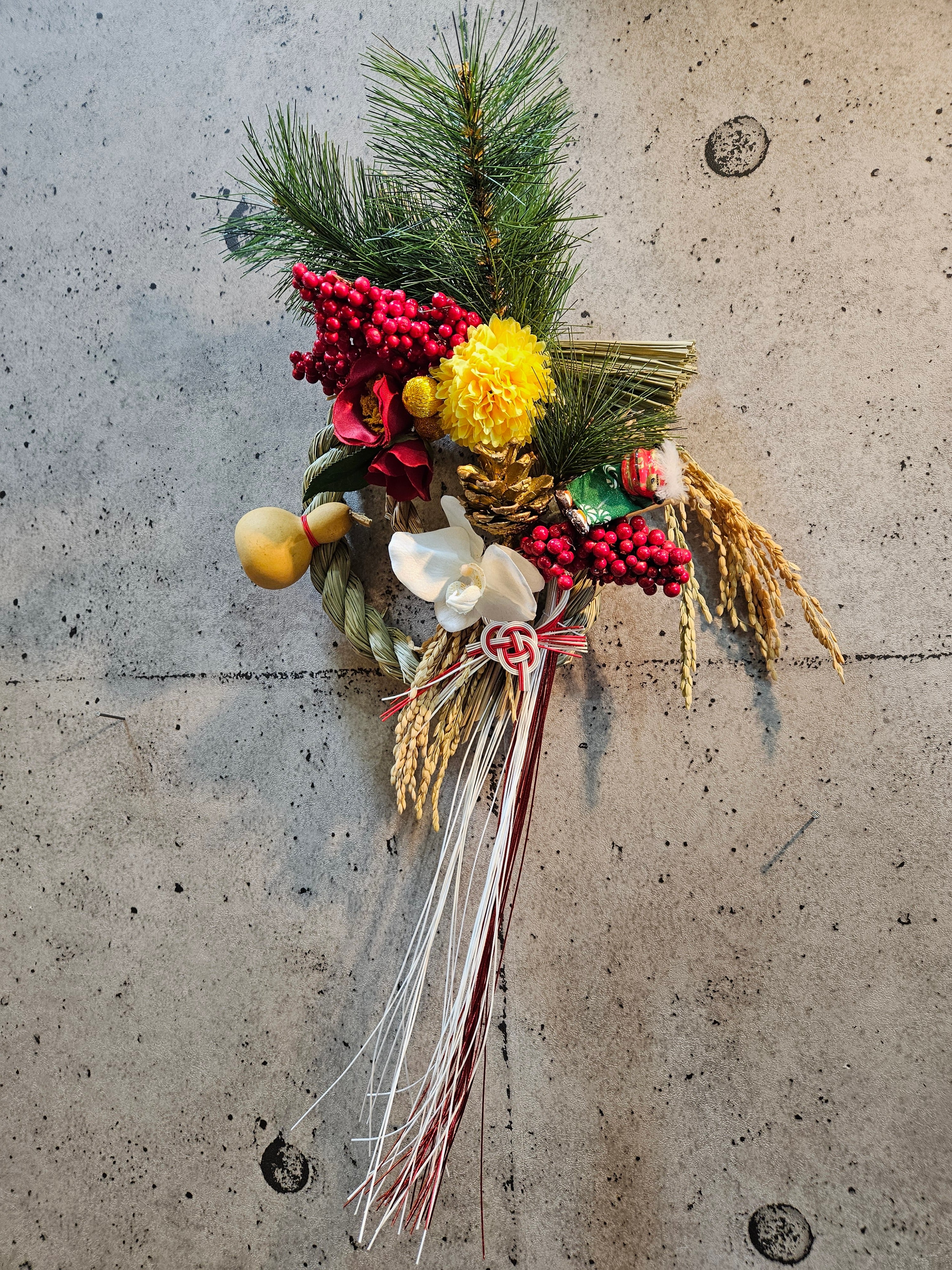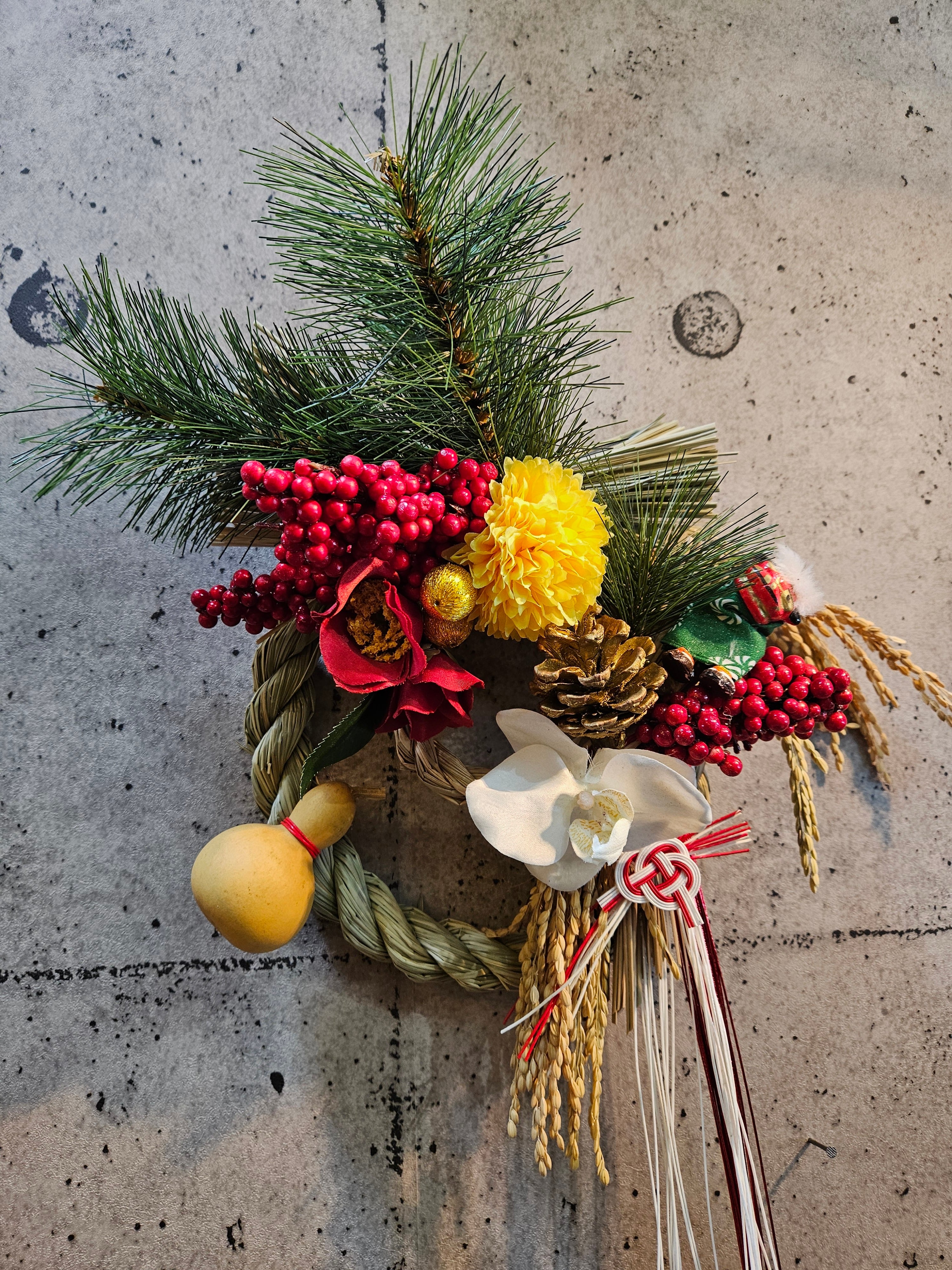 アーティフィシャルフラワー花材ーマツ、ナンテン、ポンポン菊、コチョウラン、ツバキ等