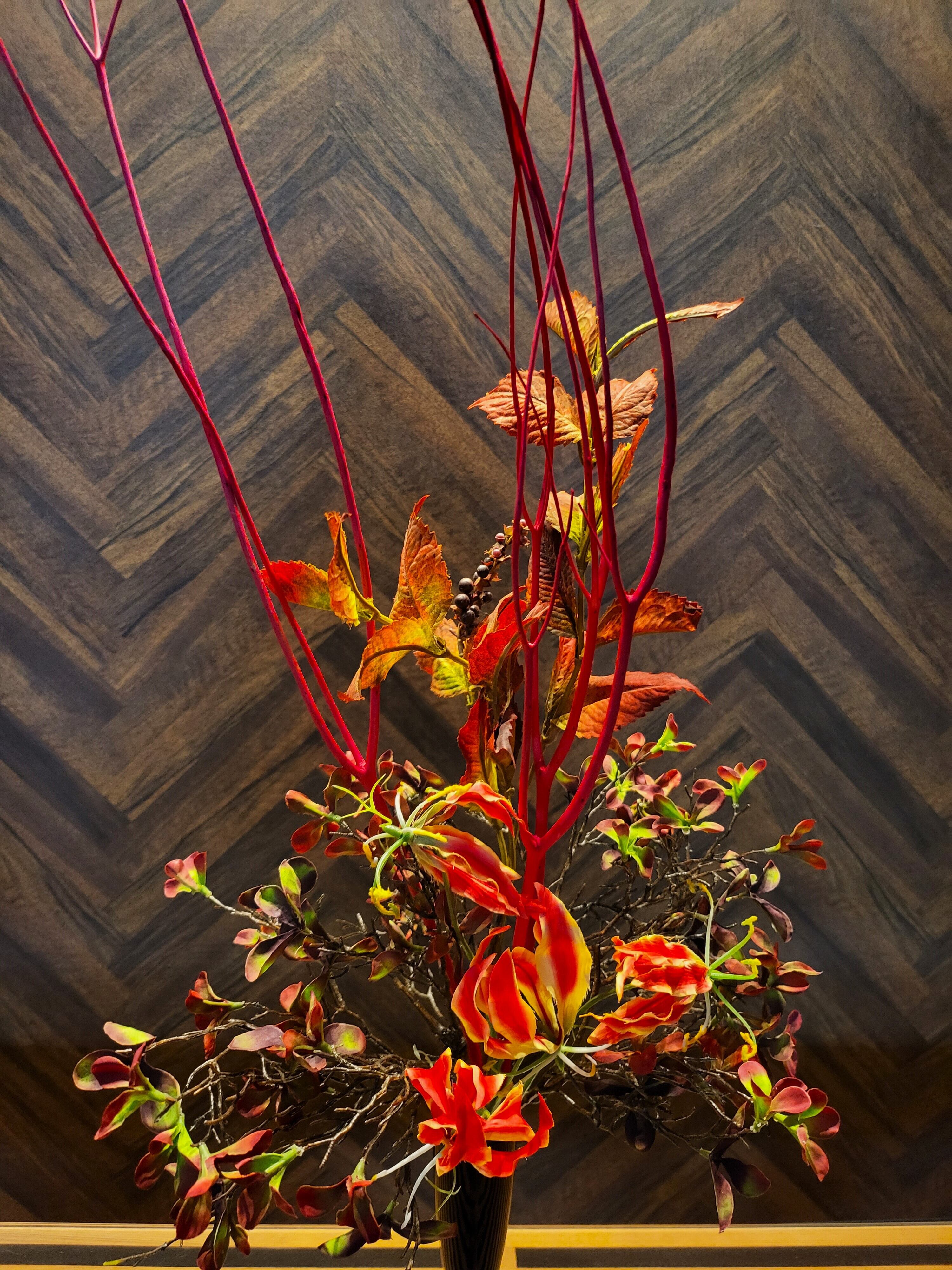 自然の花々を模した、美しく立体的なアーティシャルフラワーアレンジメントです。真っ赤な色合いが印象的な、モダンでスタイリッシュなレッドアレンジメントです。