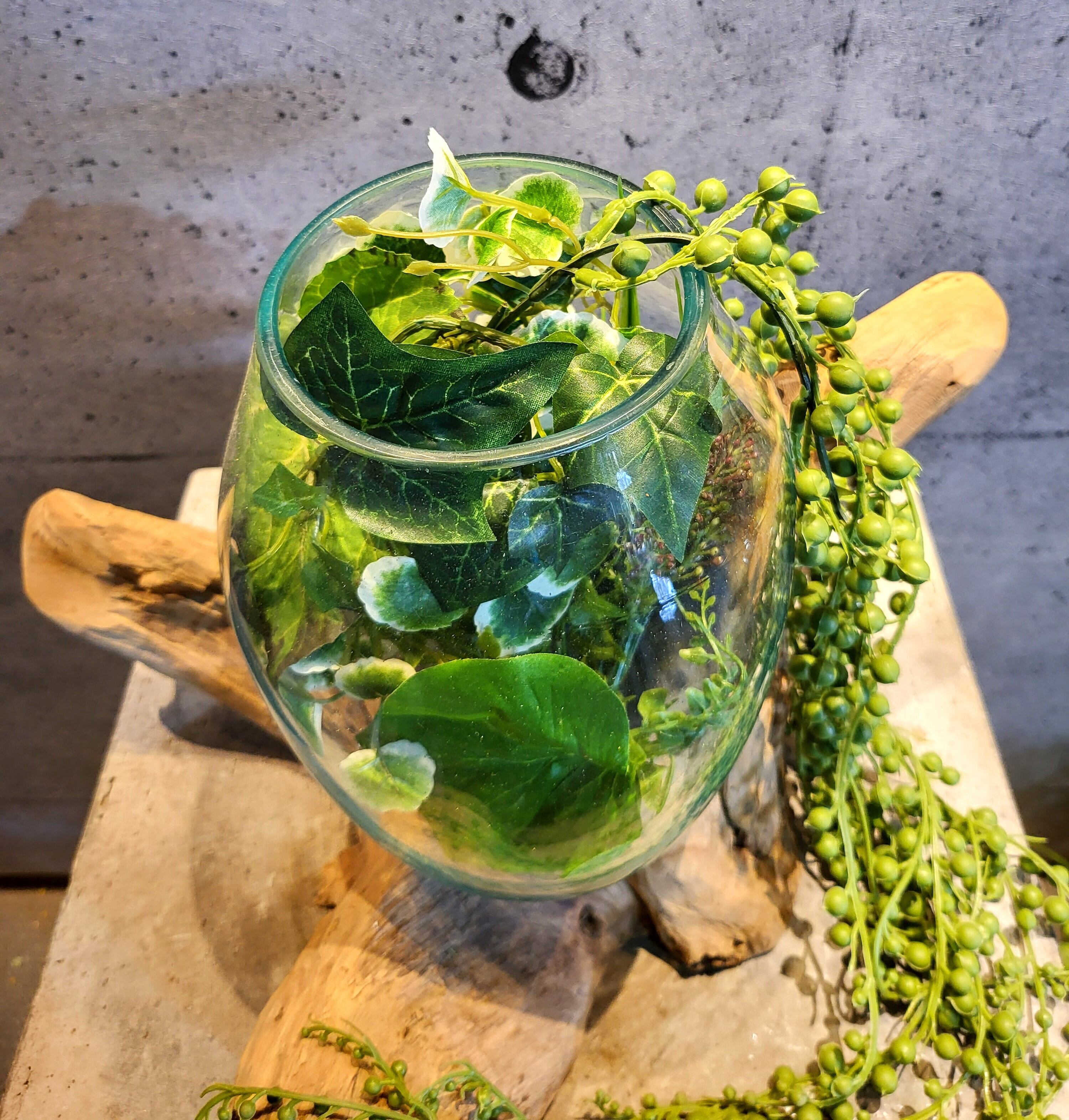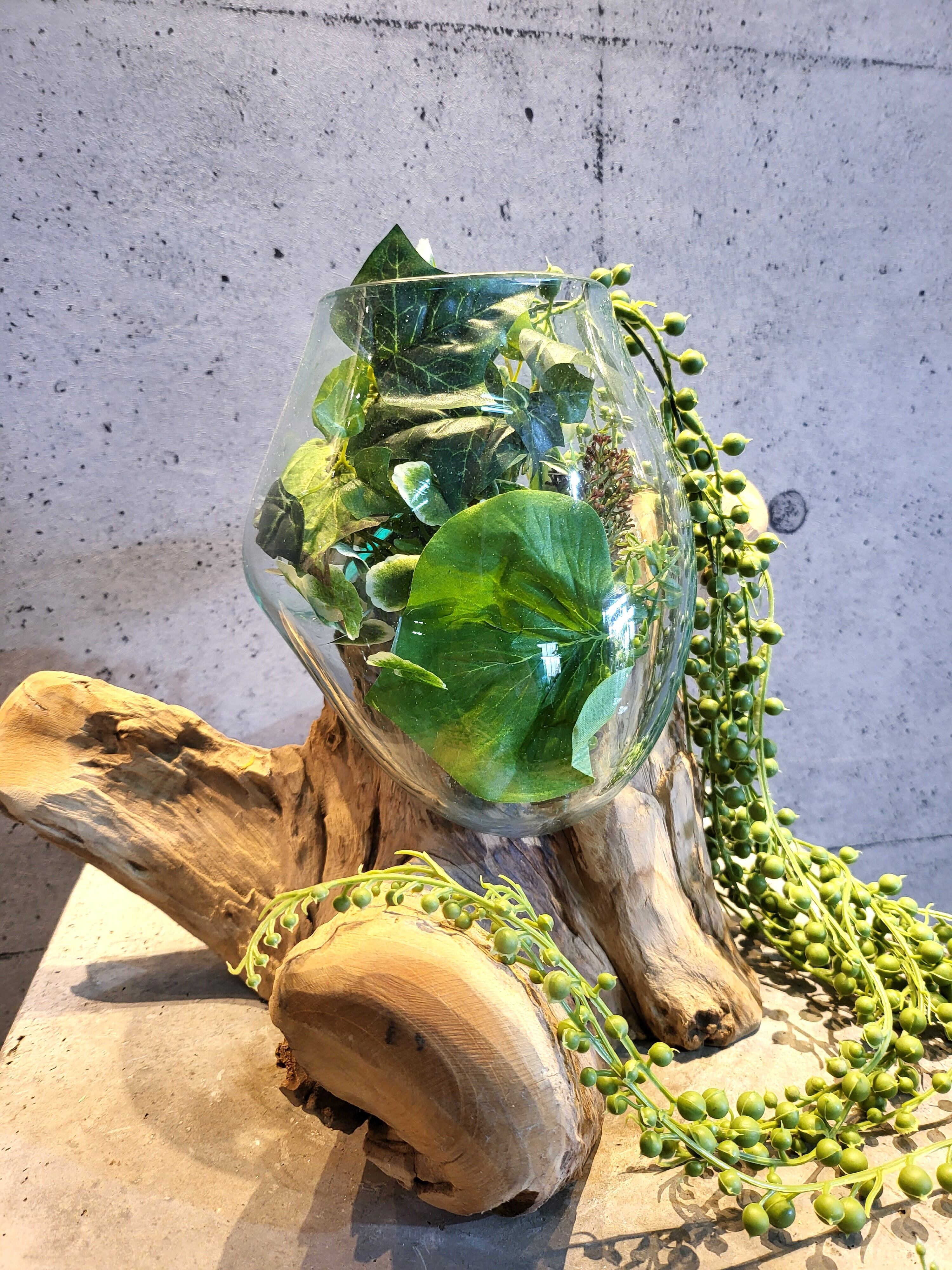 アーティシャルフラワー グリーンアレンジメントとウッドの色合いを基調にした流木の変形ガラスの花器と合わせたアイテム。