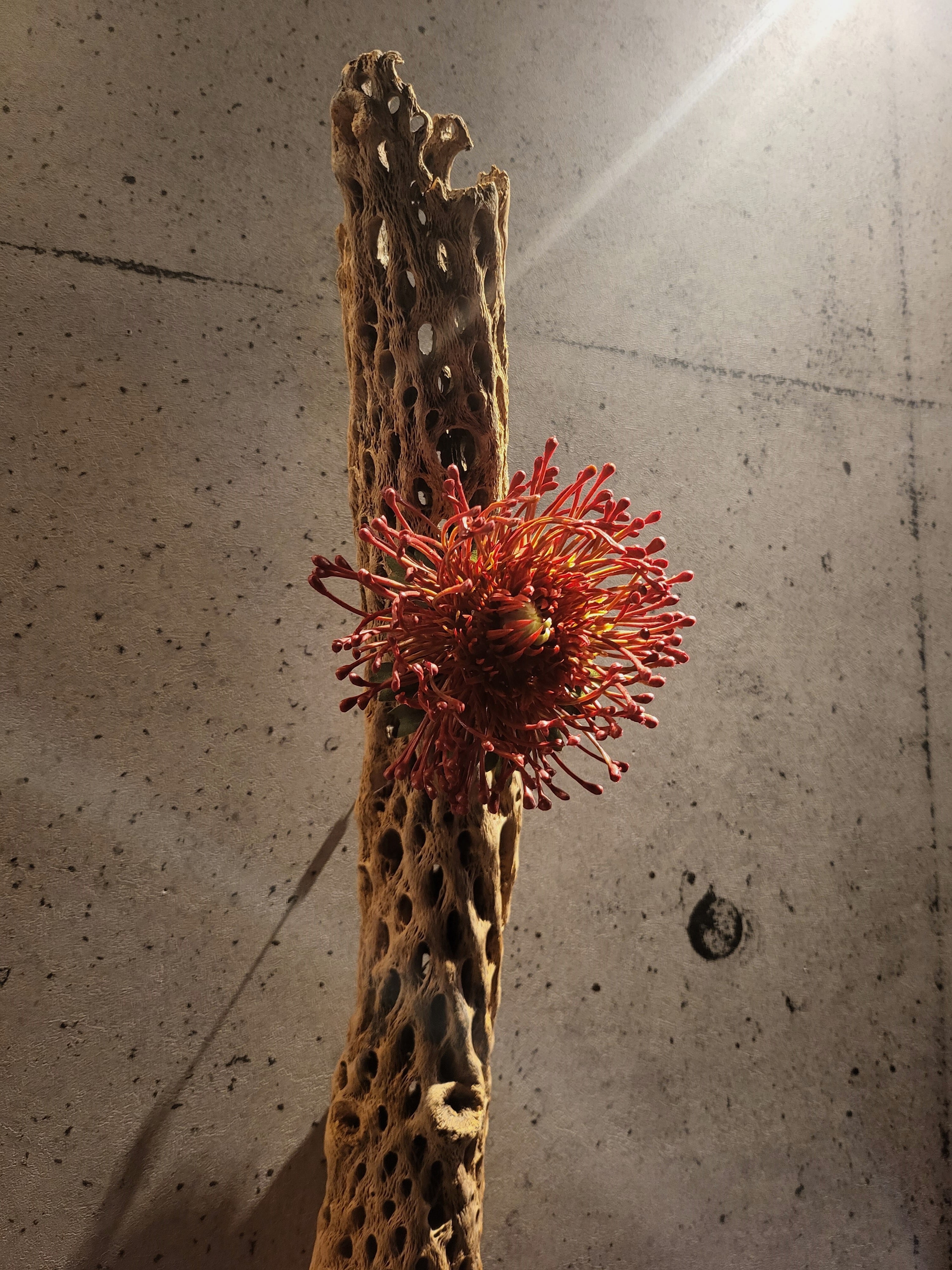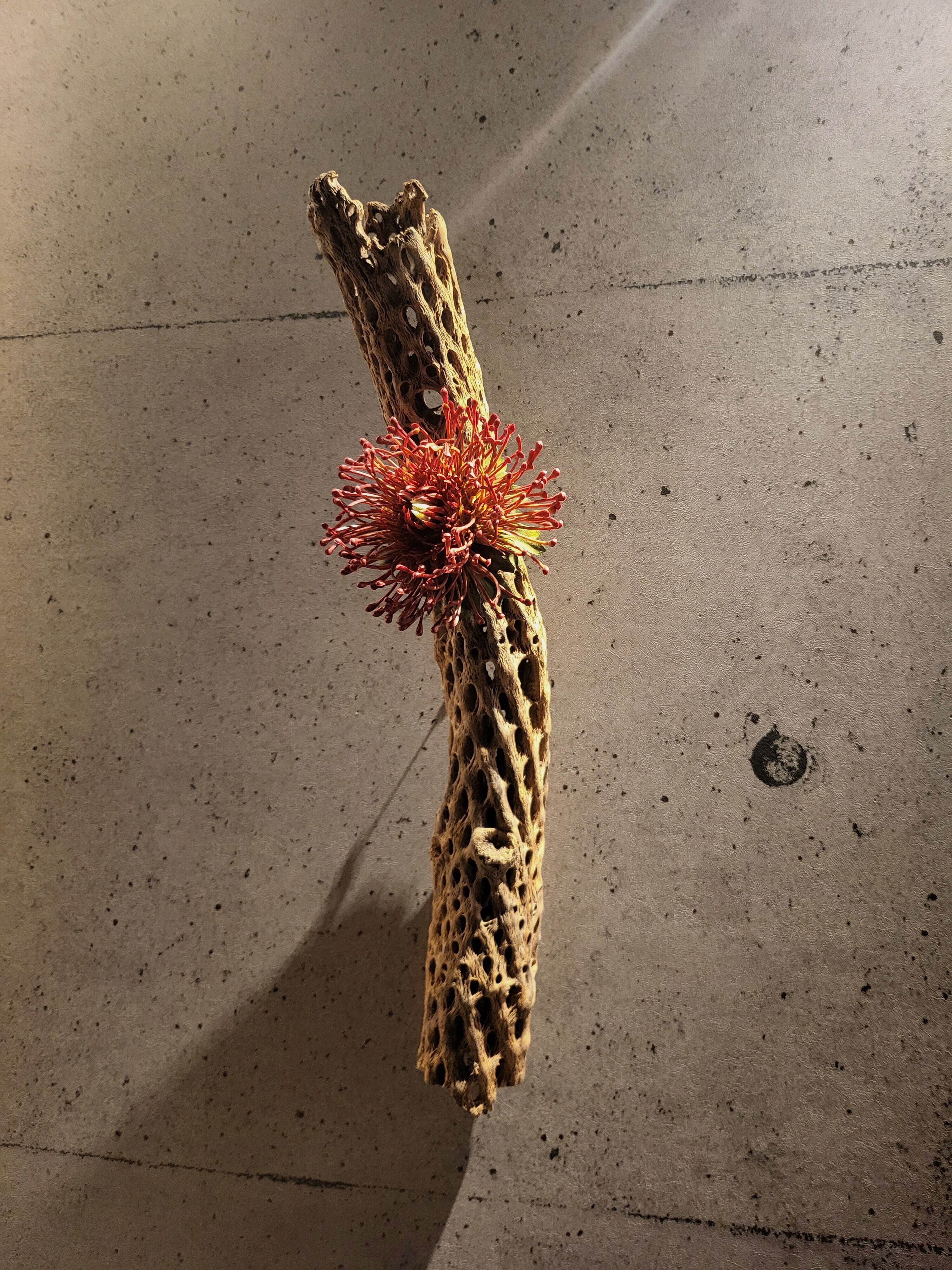 ドライのサボテンの骨にアーティシャルフラワーを一輪合わせています。