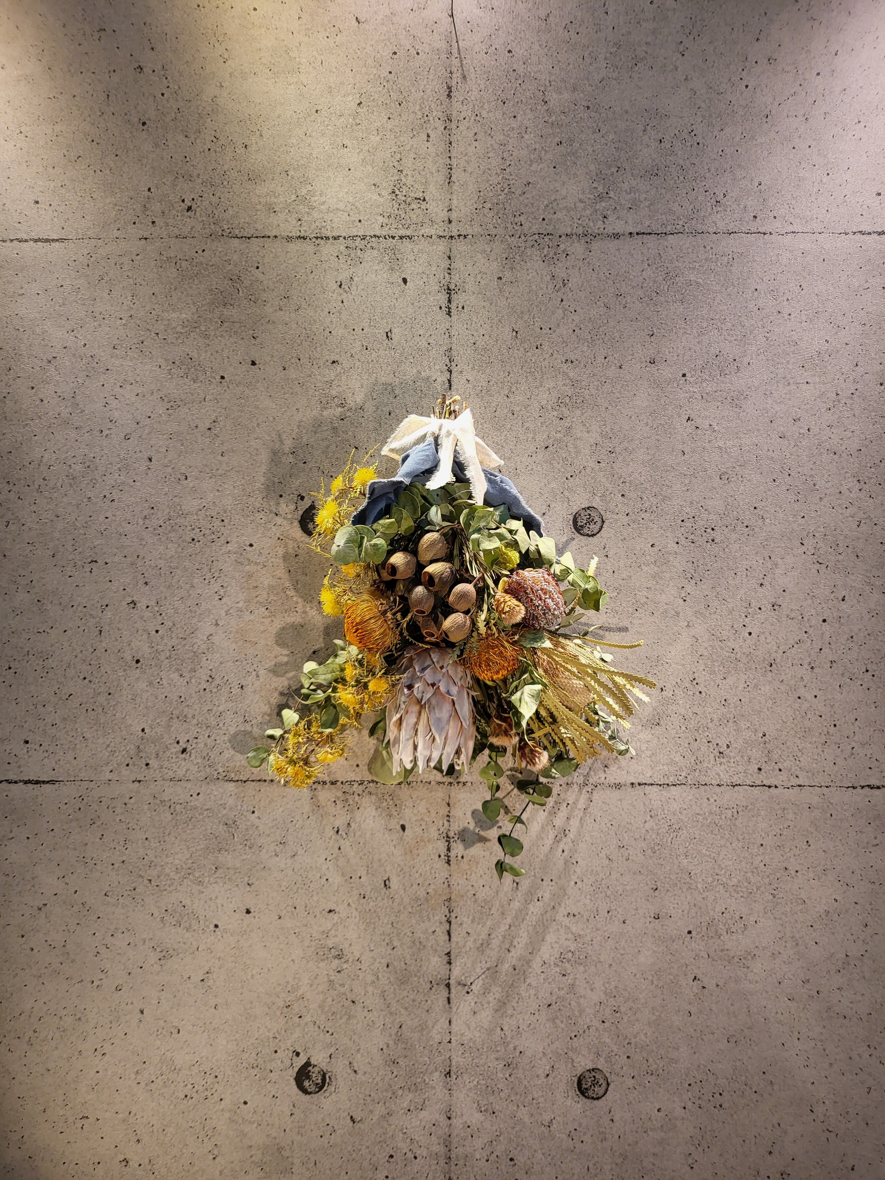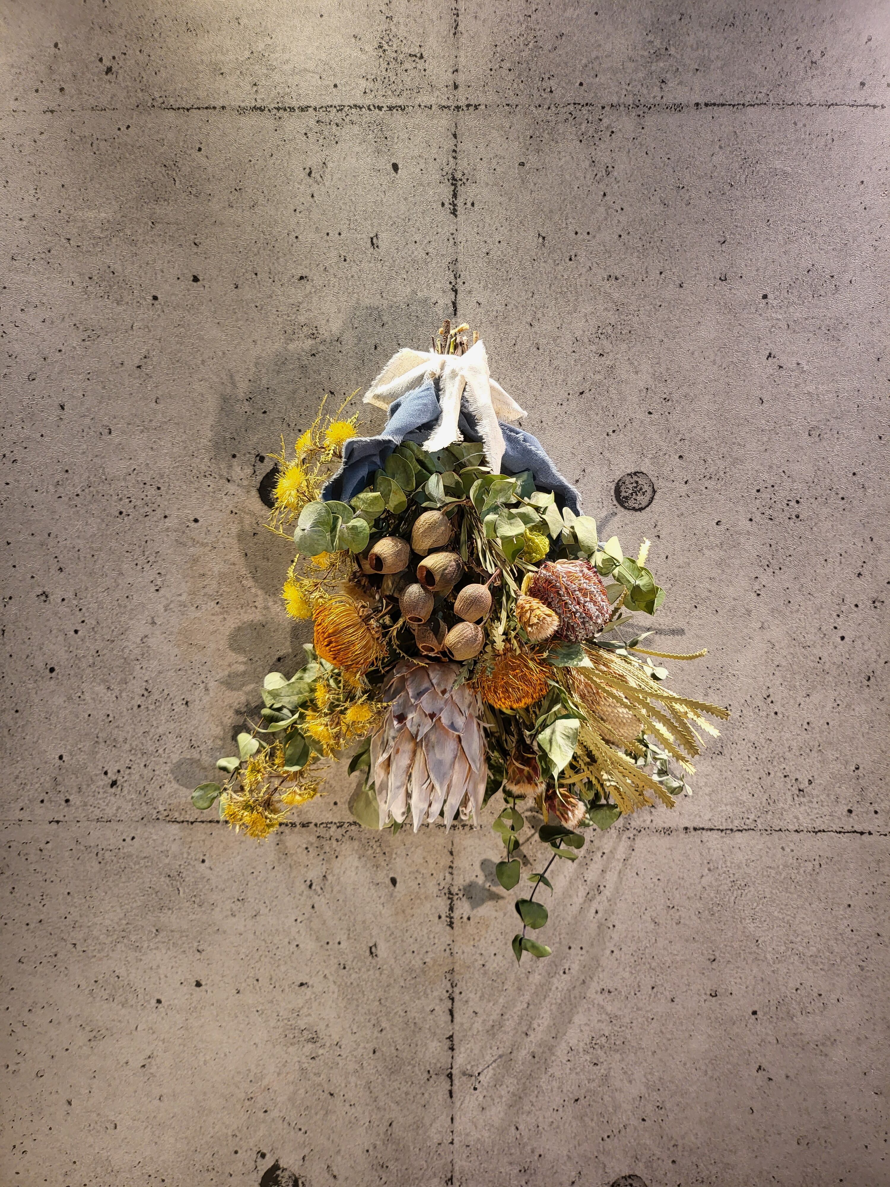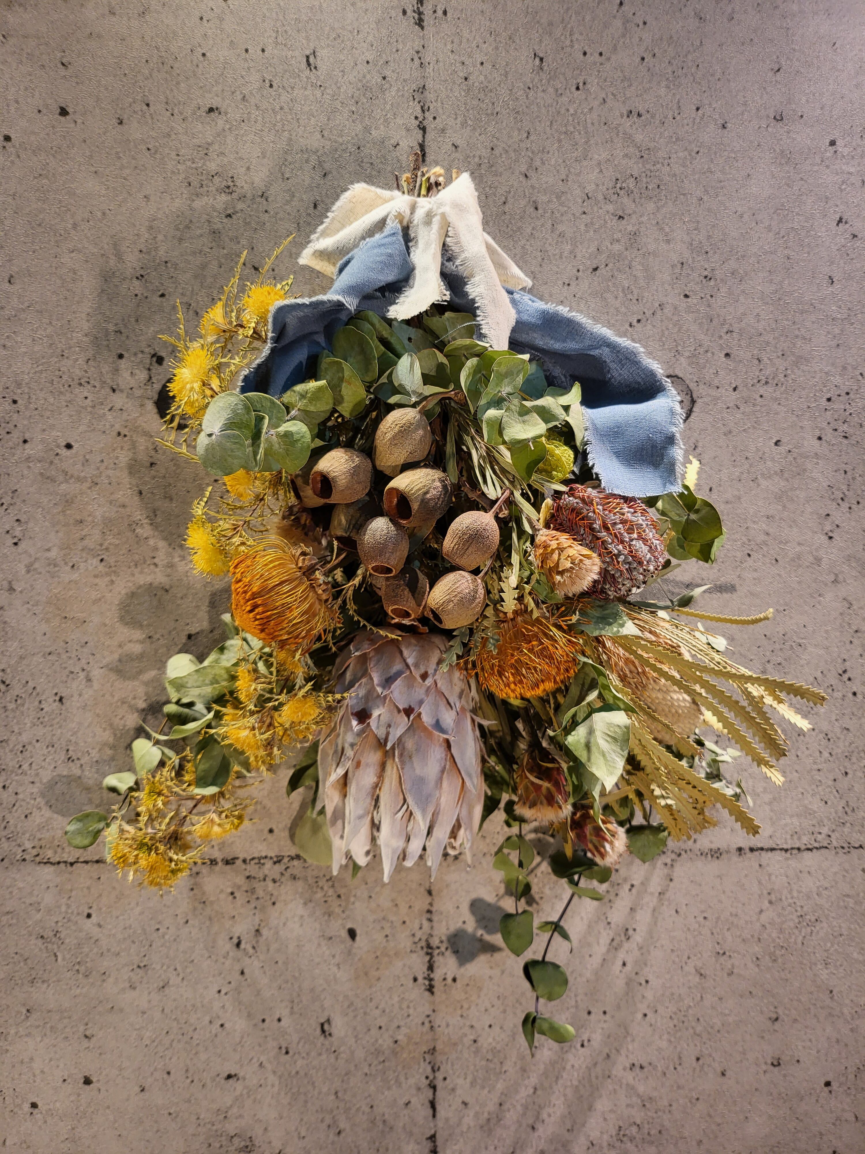 キングプロテア、ユーカリベルガムナッツ、バンクシア等で当ショップ独自のオリジナルデザインで作製致しました。