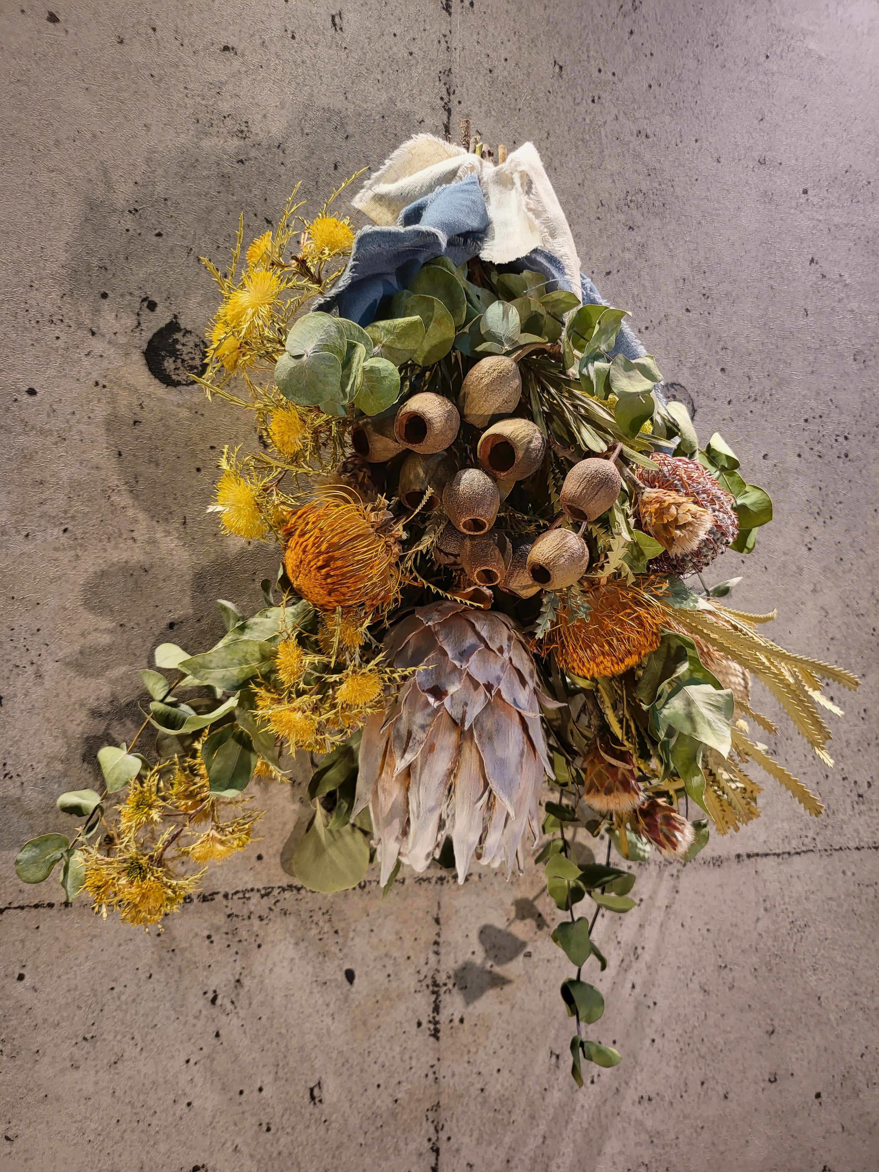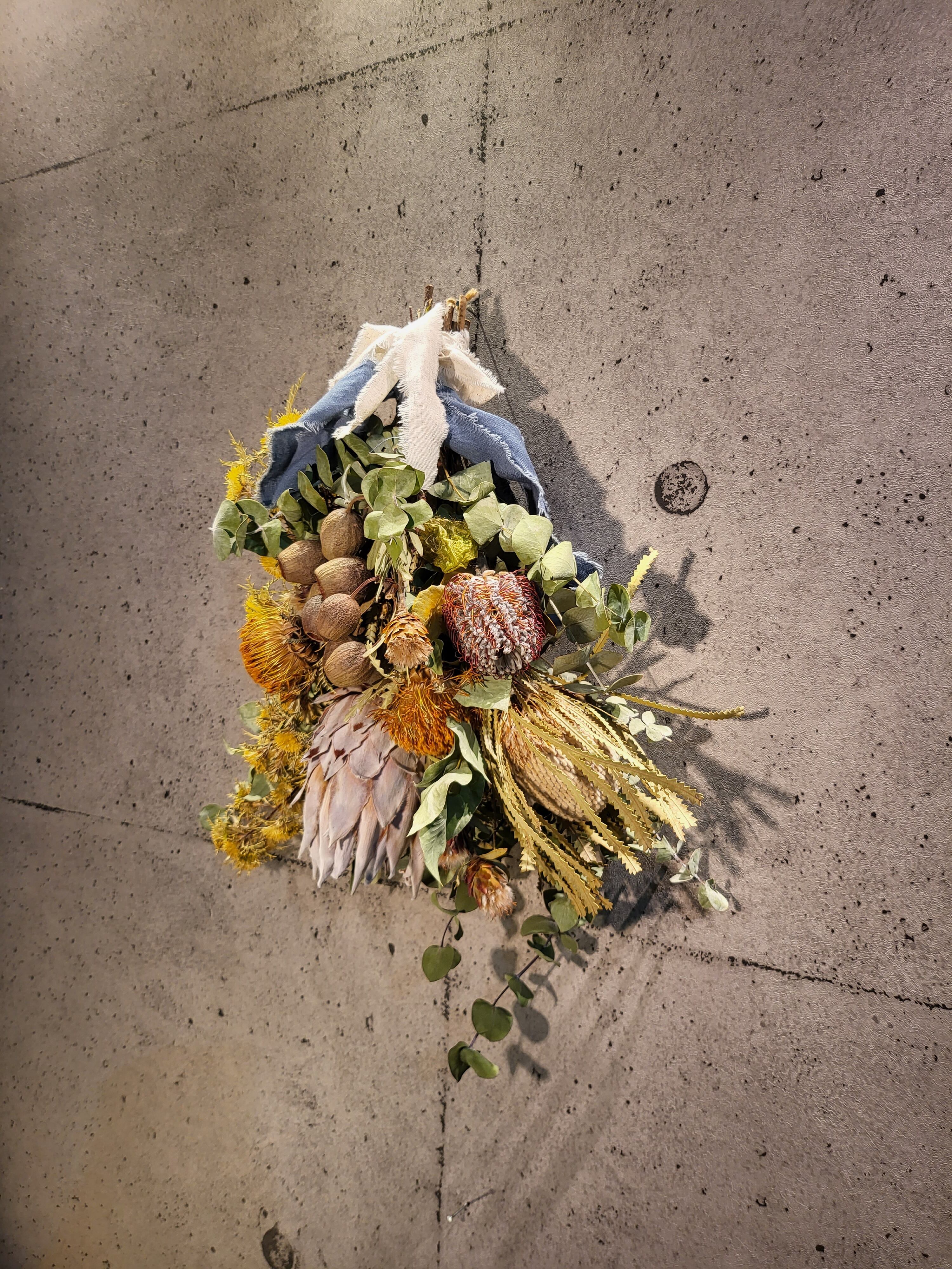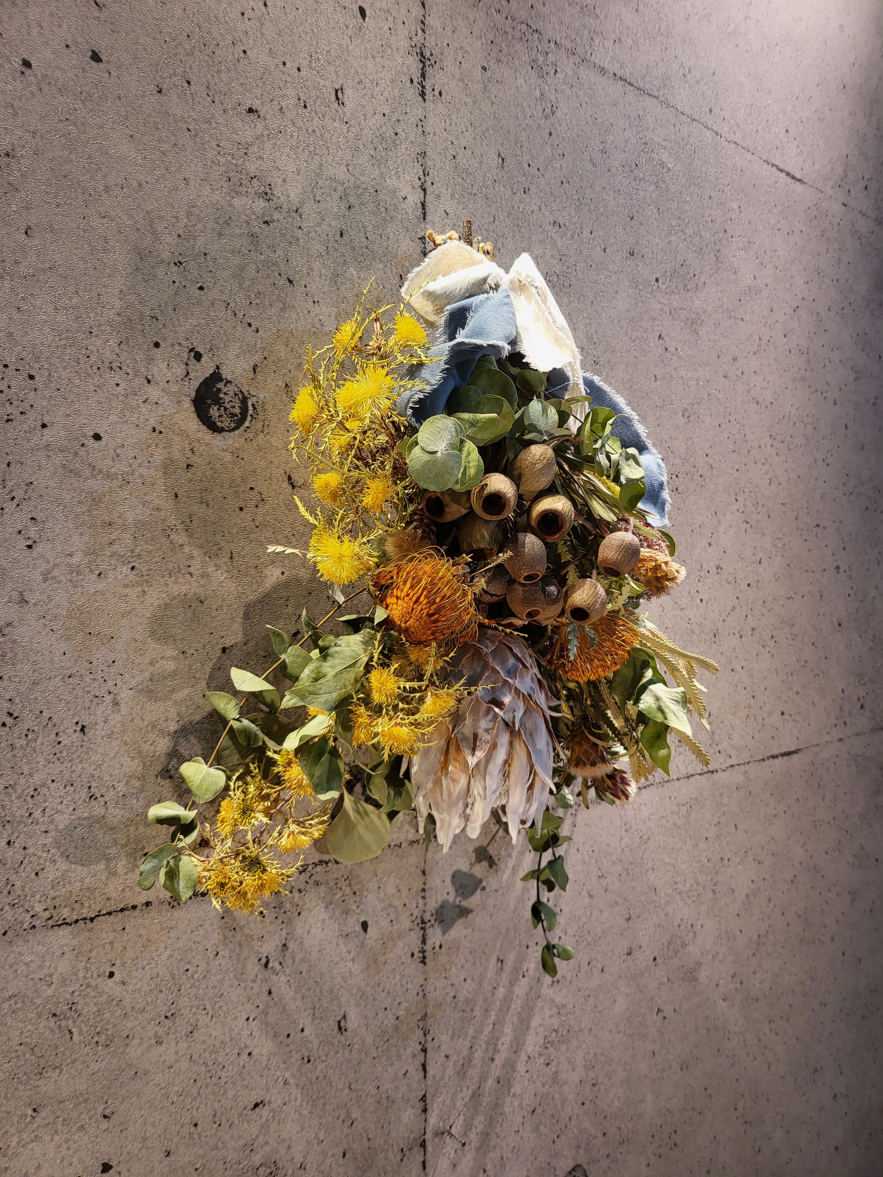 キングプロテア、ユーカリベルガムナッツ、バンクシア等で当ショップ独自のオリジナルデザインで作製致しました。