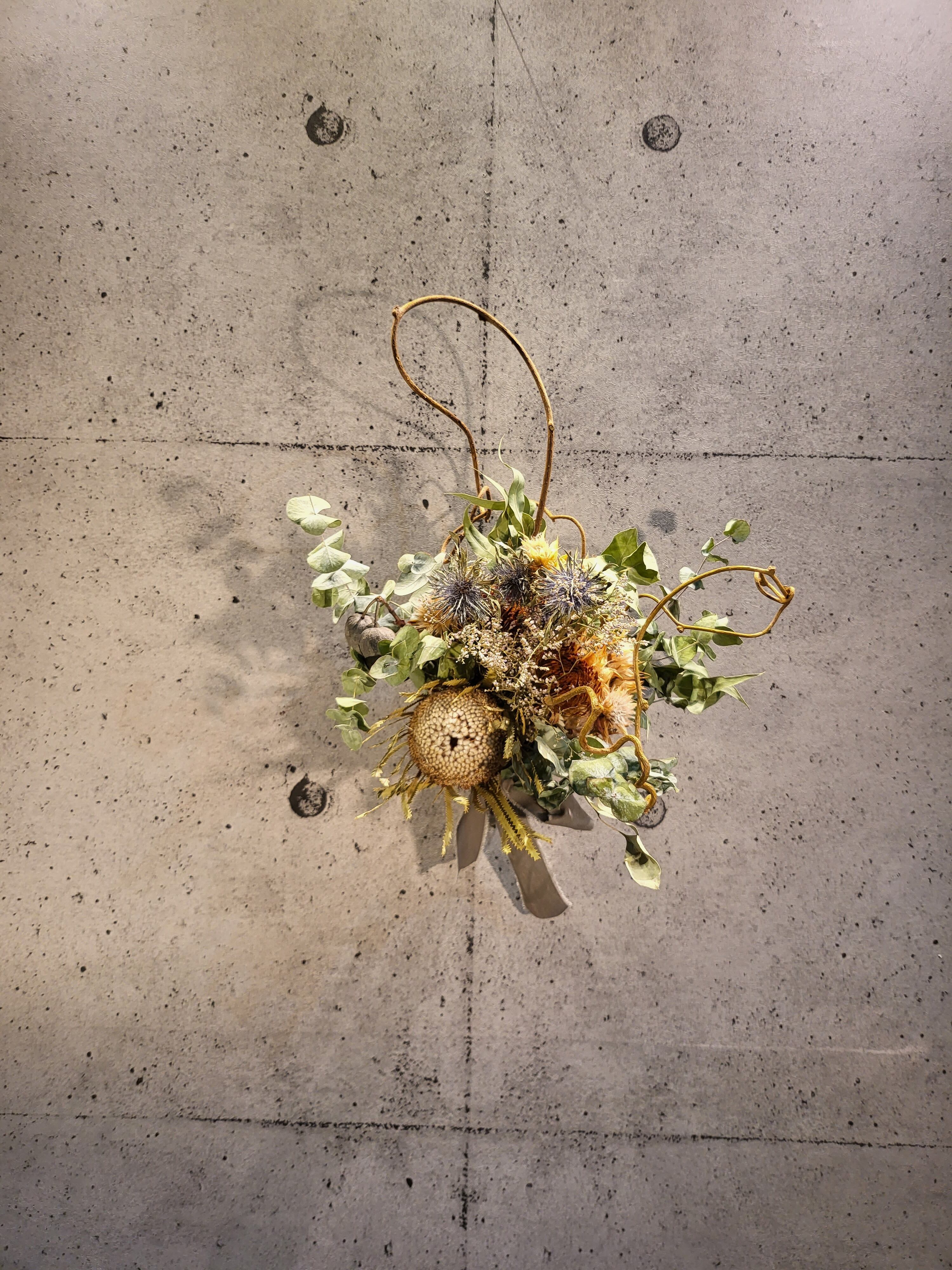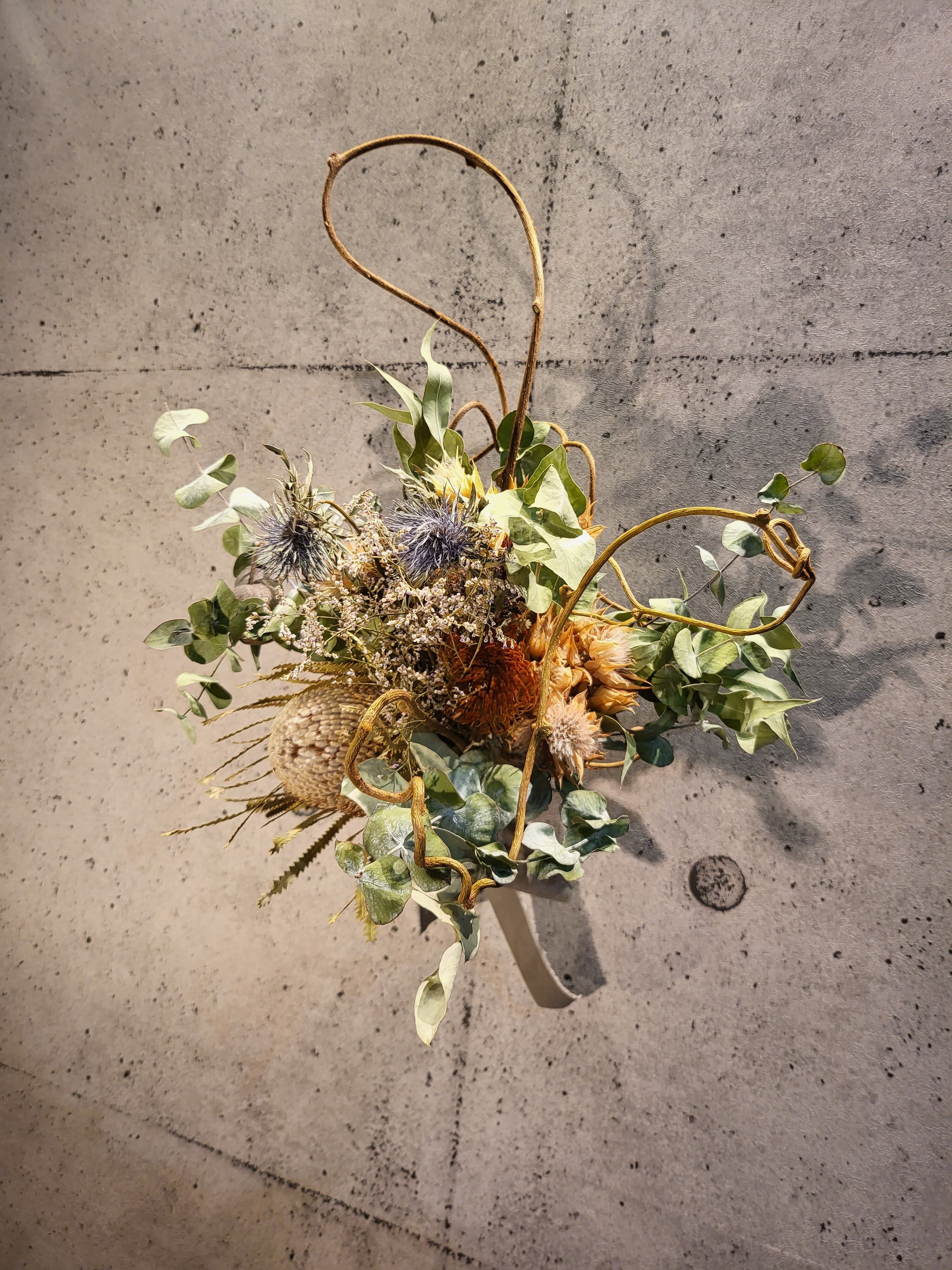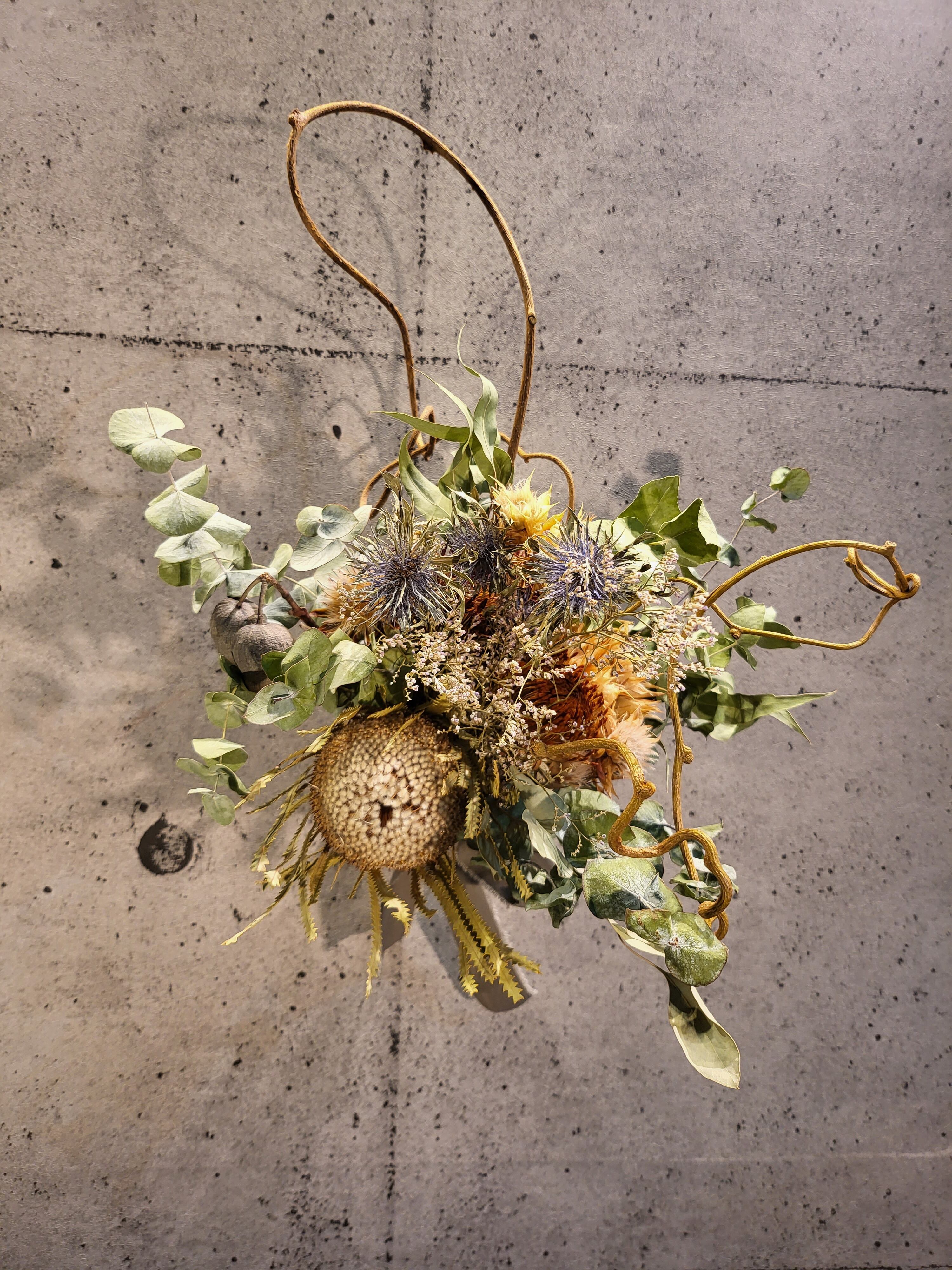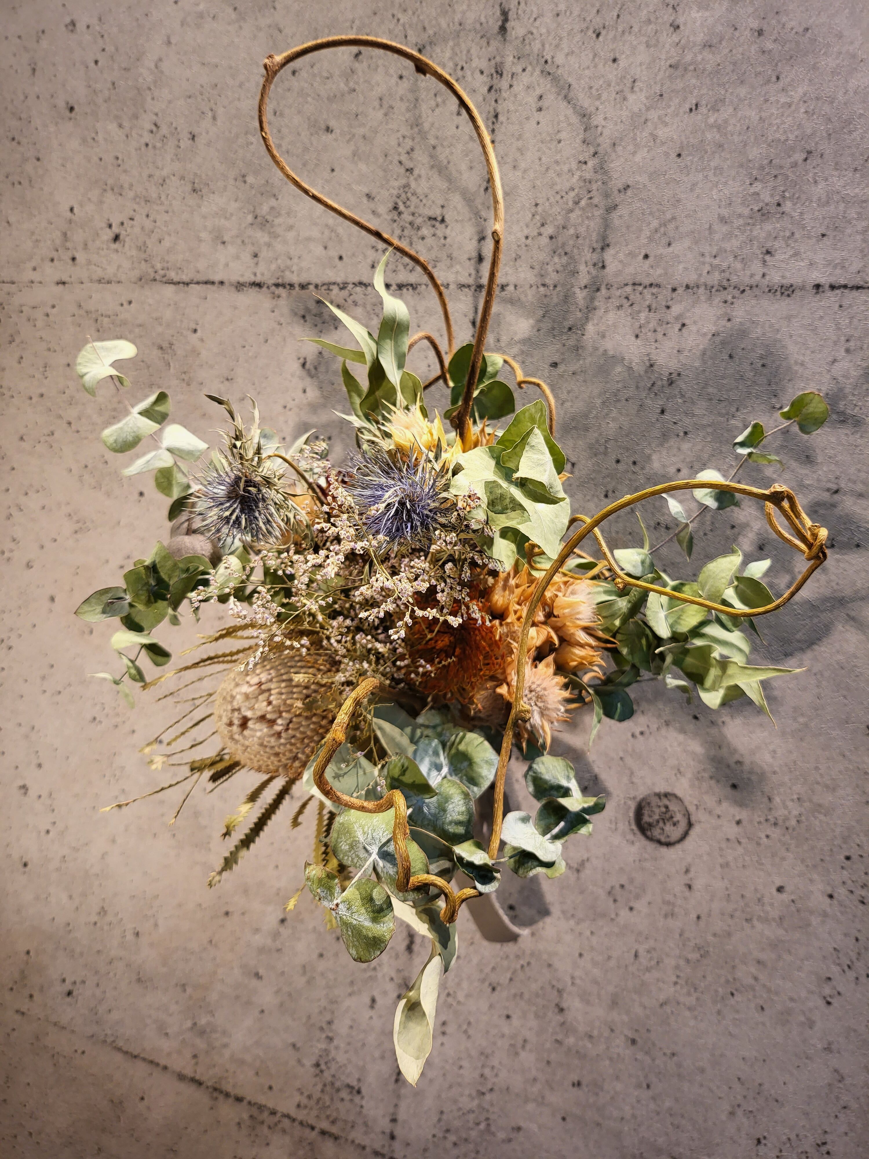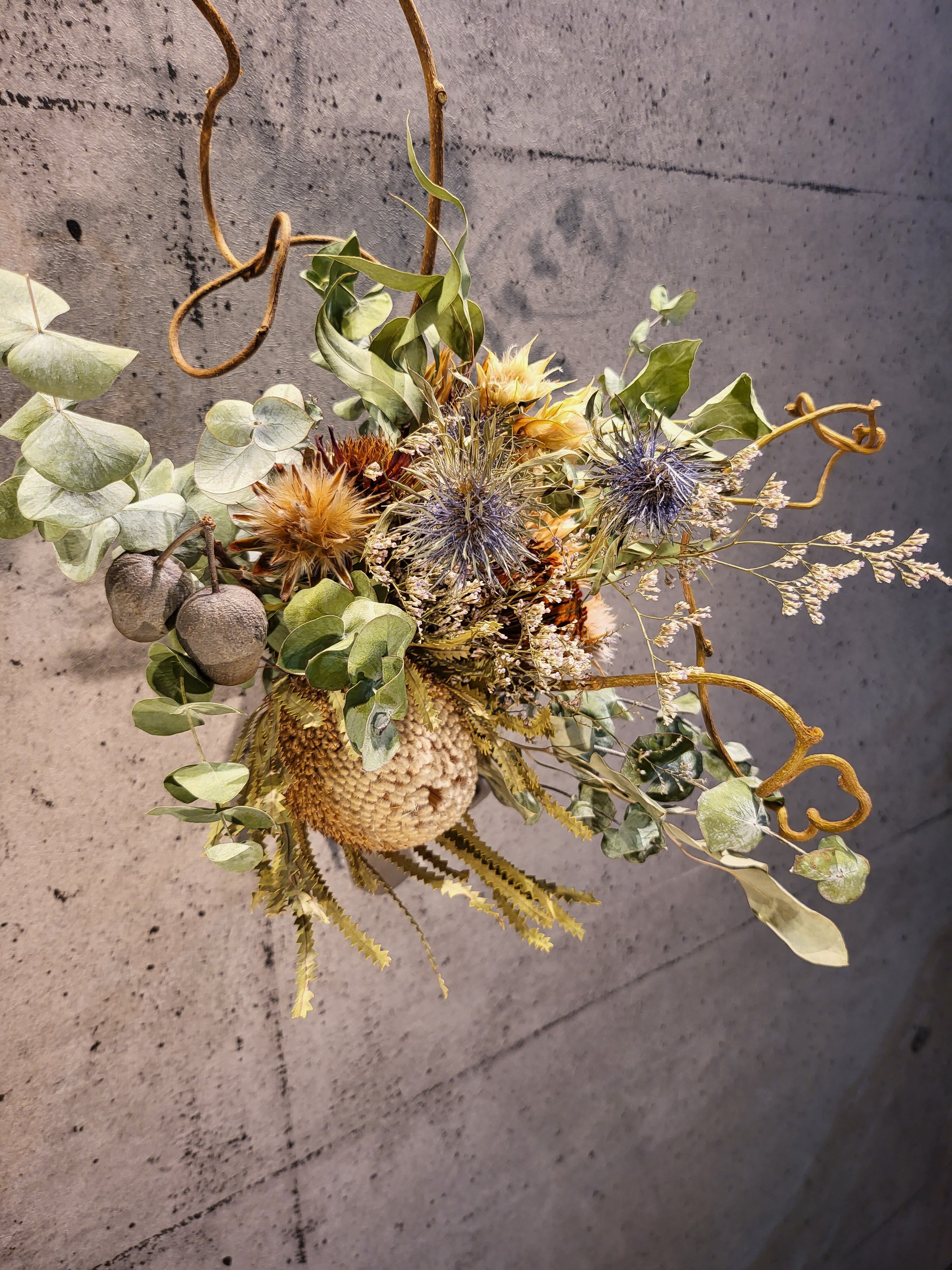 バンクシア、エリンジウム、ユーカリベルガムナッツ、ユーカリ等で当ショップ独自のオリジナルデザインで作製致しました。