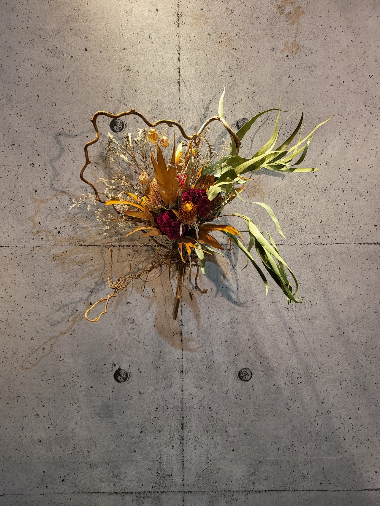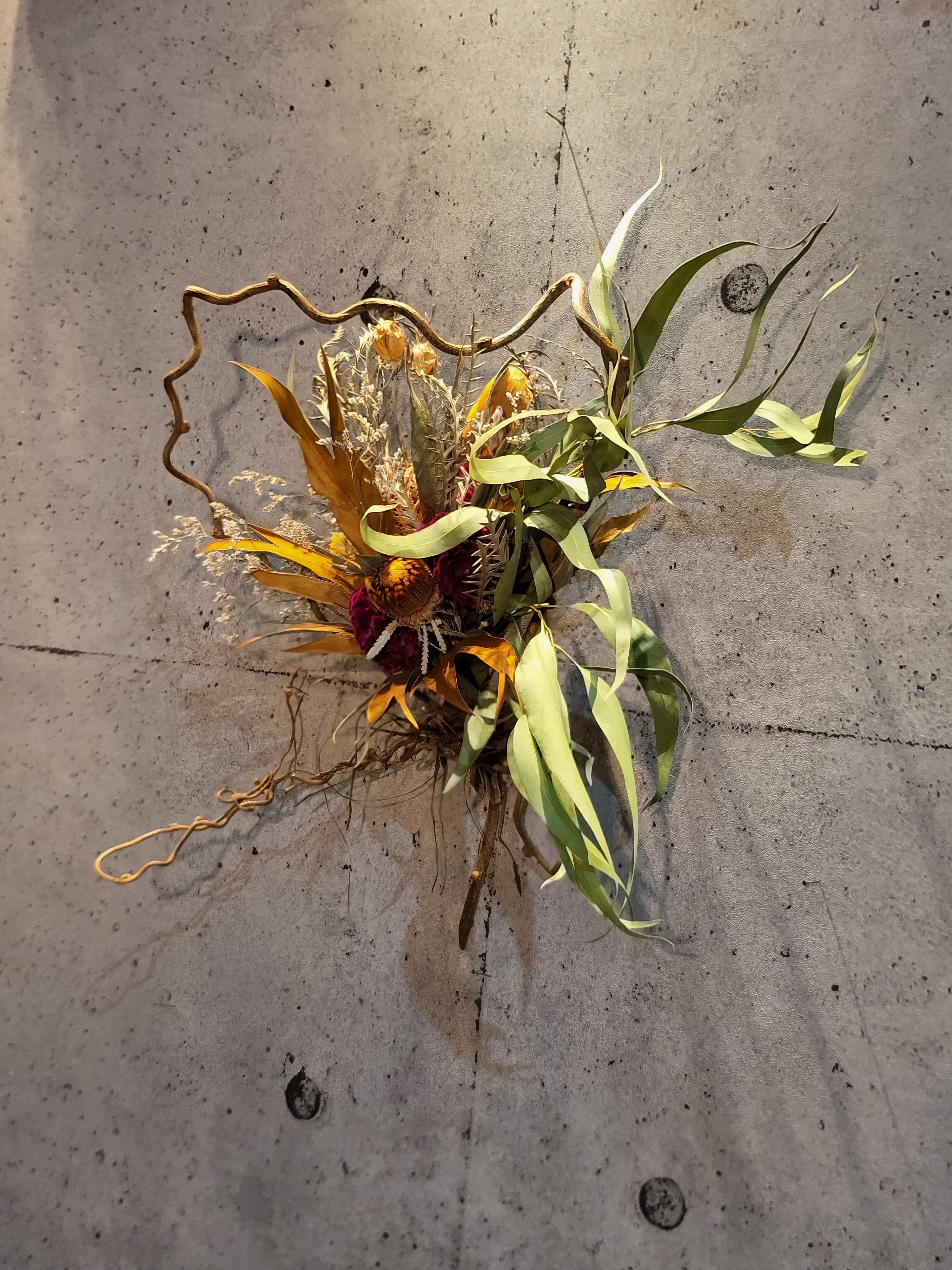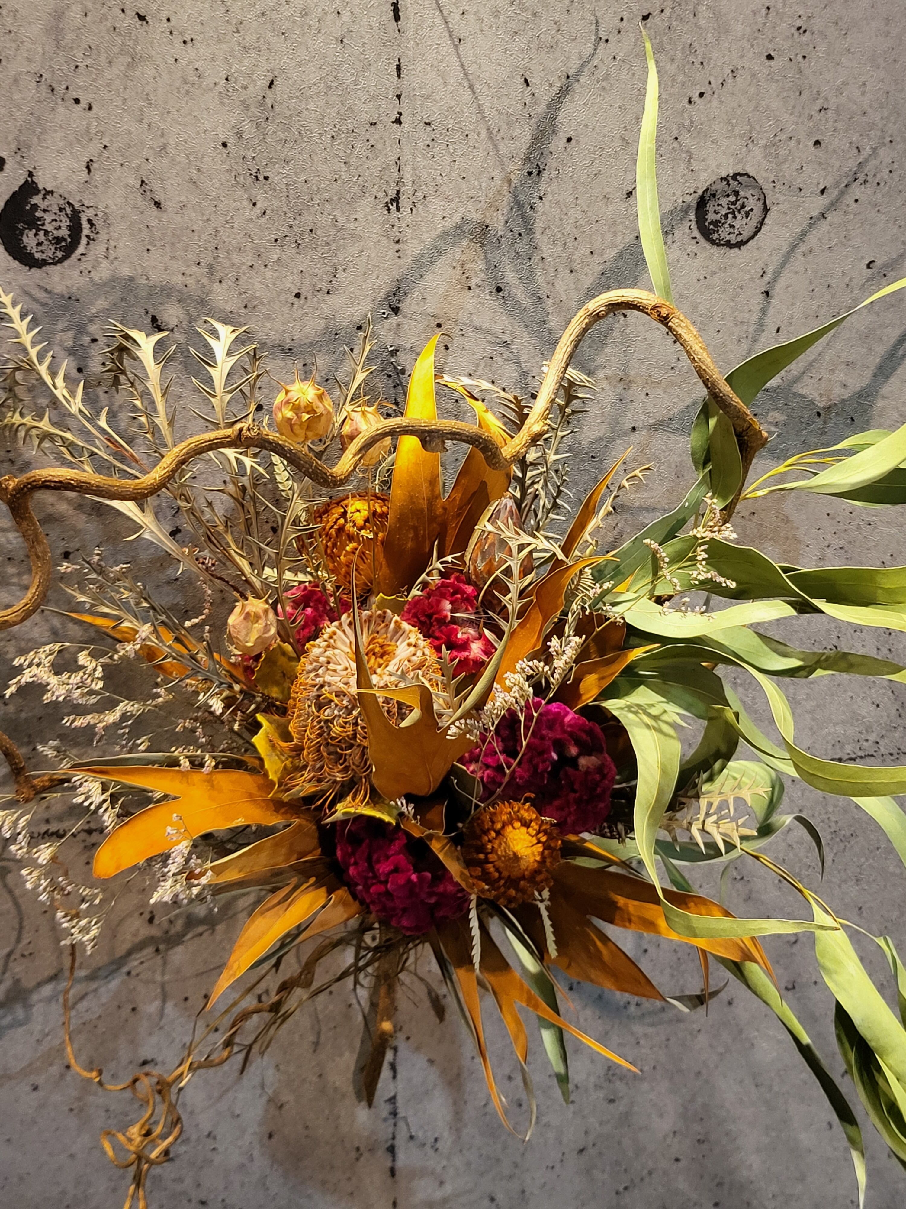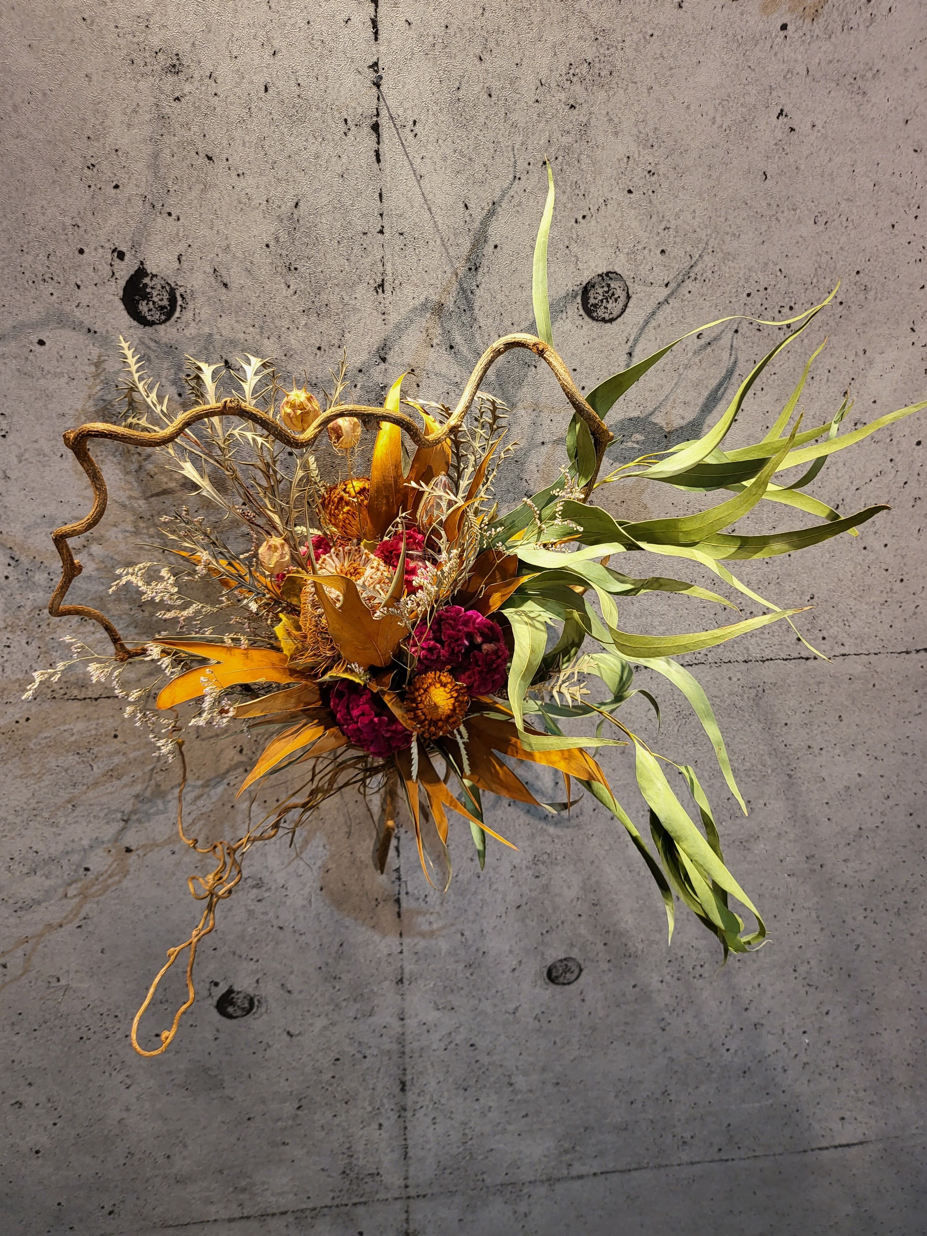 ケイトウ、バンクシア、ユーカリ、グレビレア等で当ショップ独自のオリジナルデザインで作製致しました。