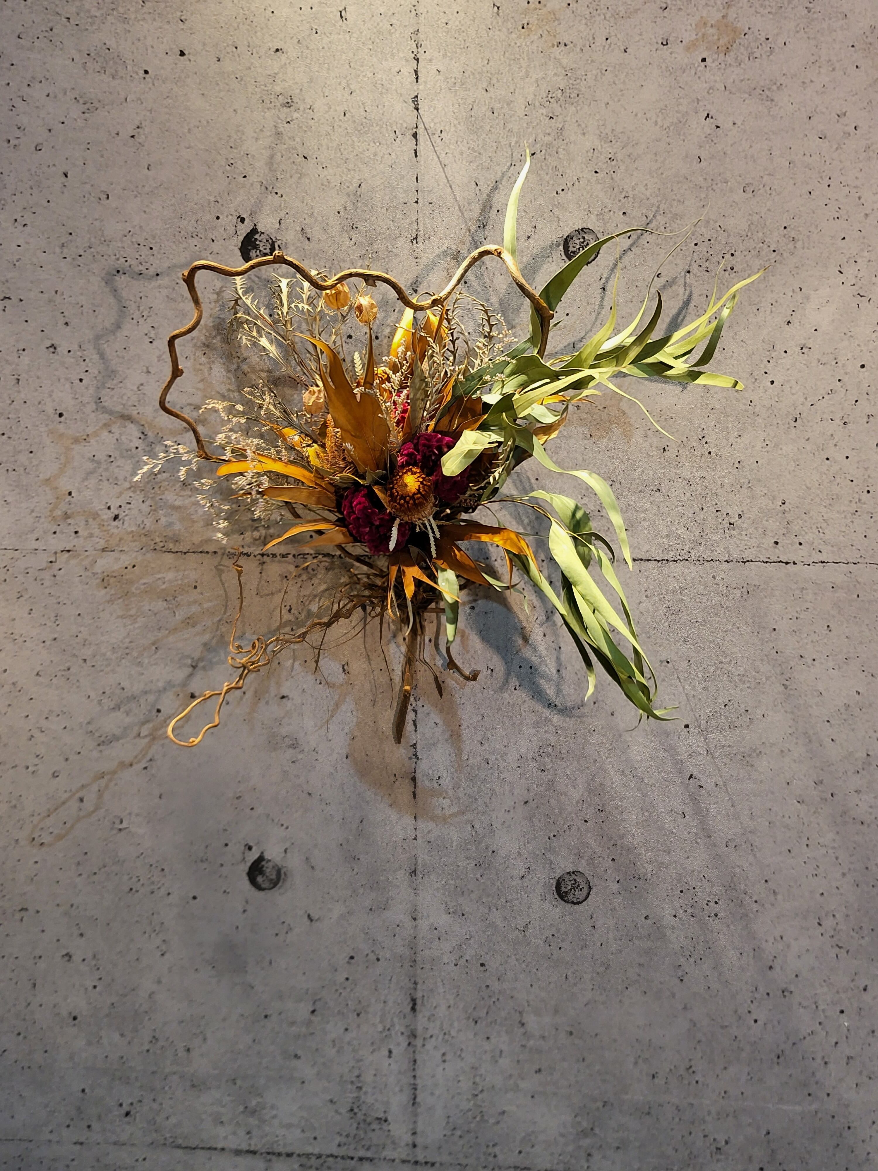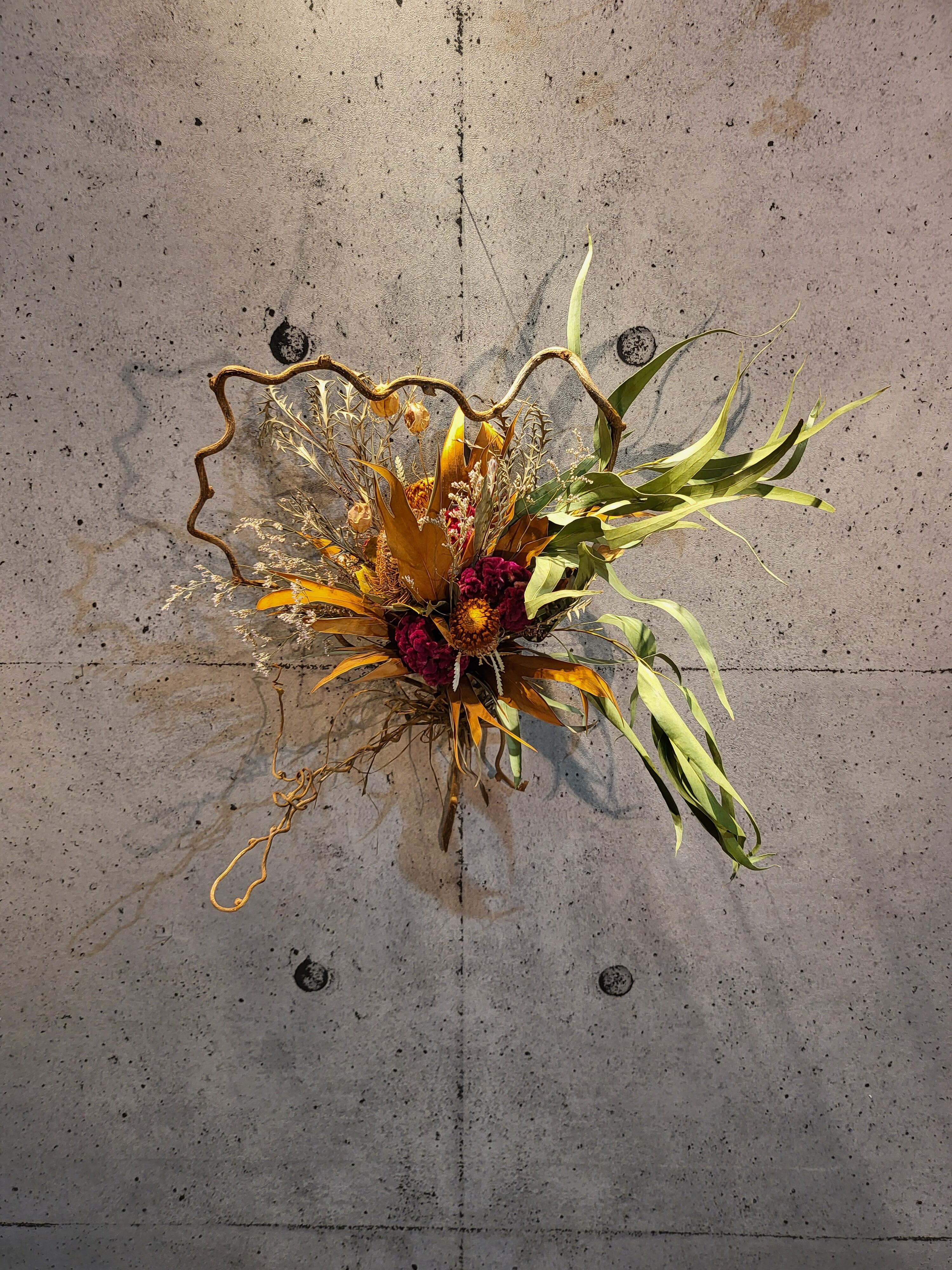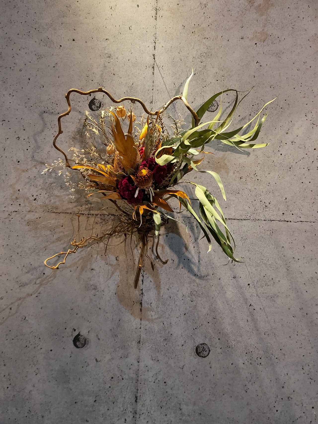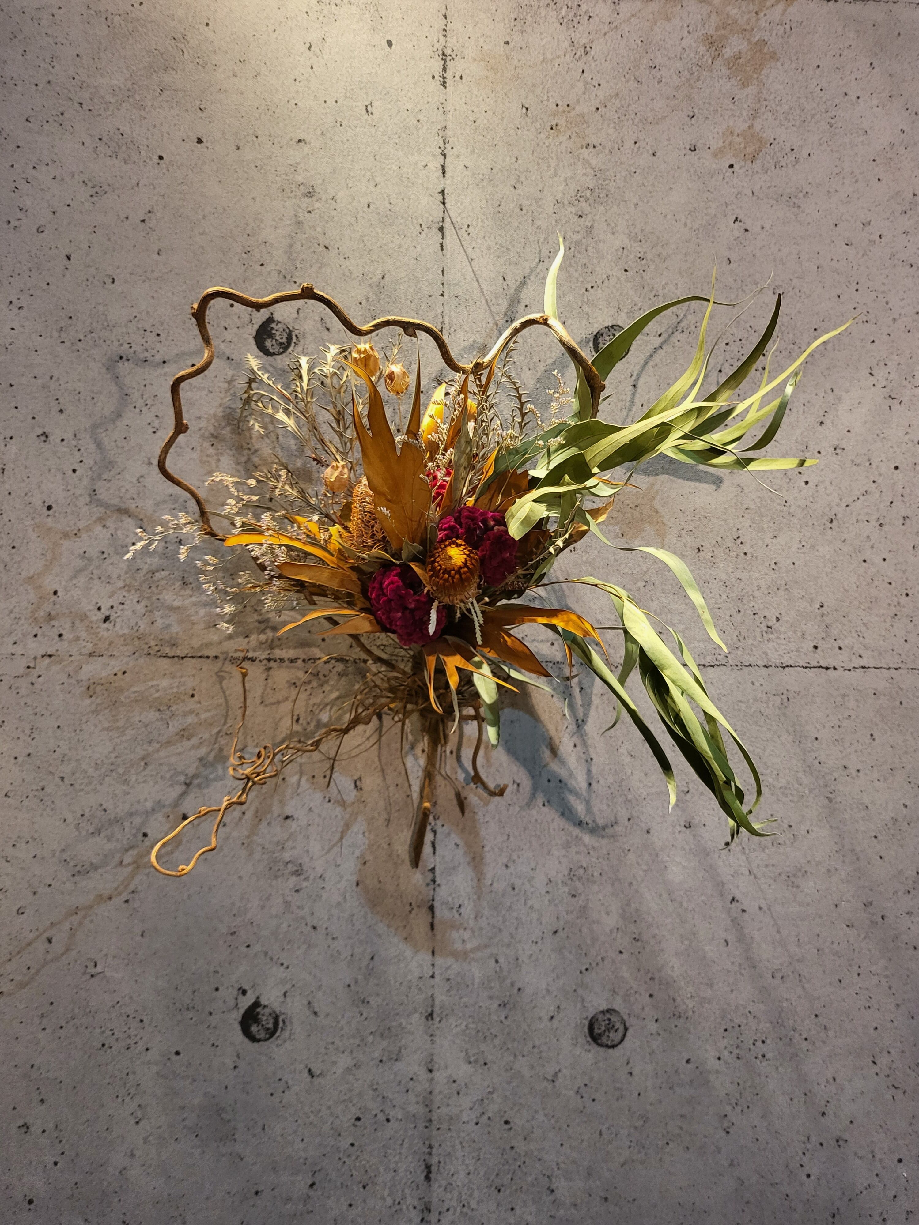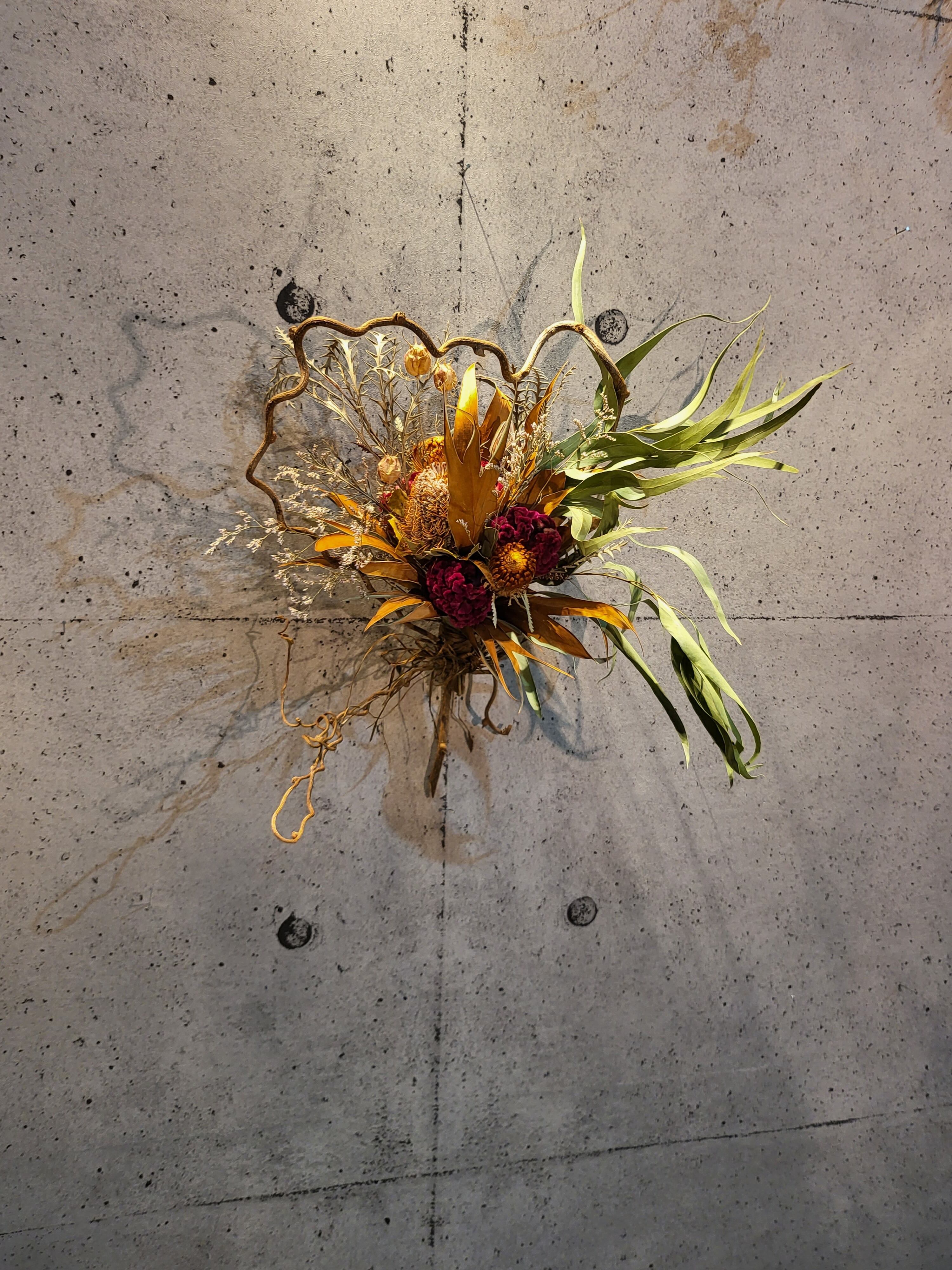 ケイトウ、バンクシア、ユーカリ、グレビレア等で当ショップ独自のオリジナルデザインで作製致しました。