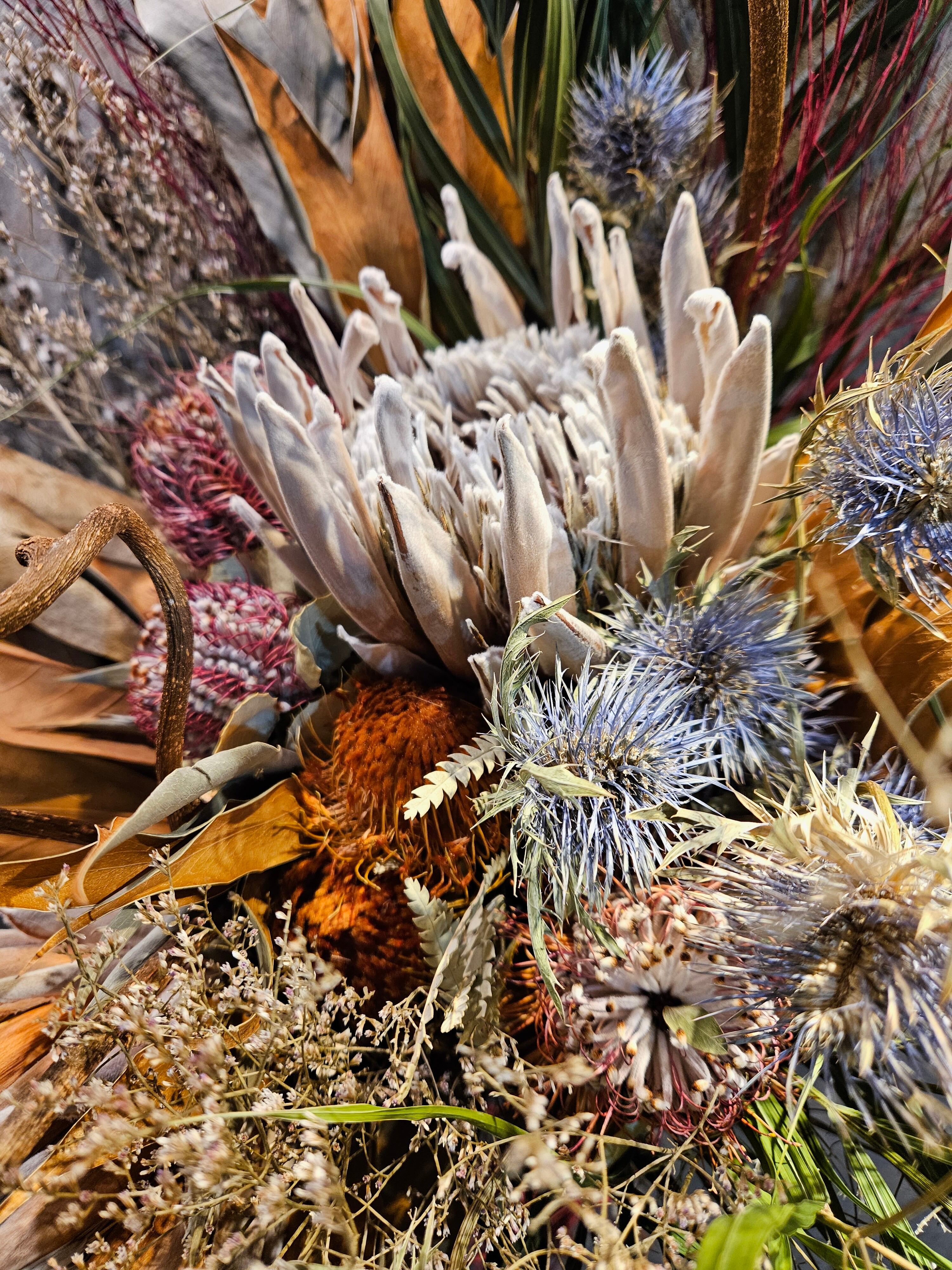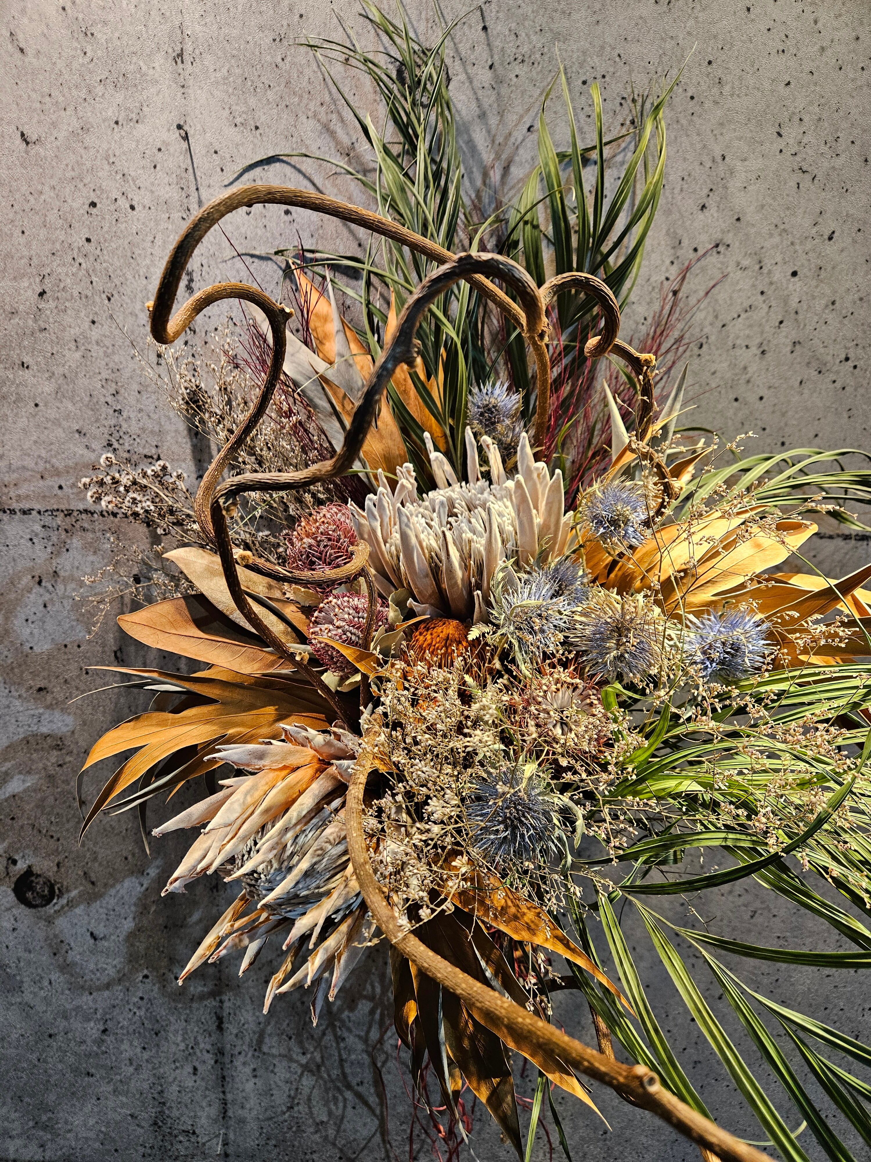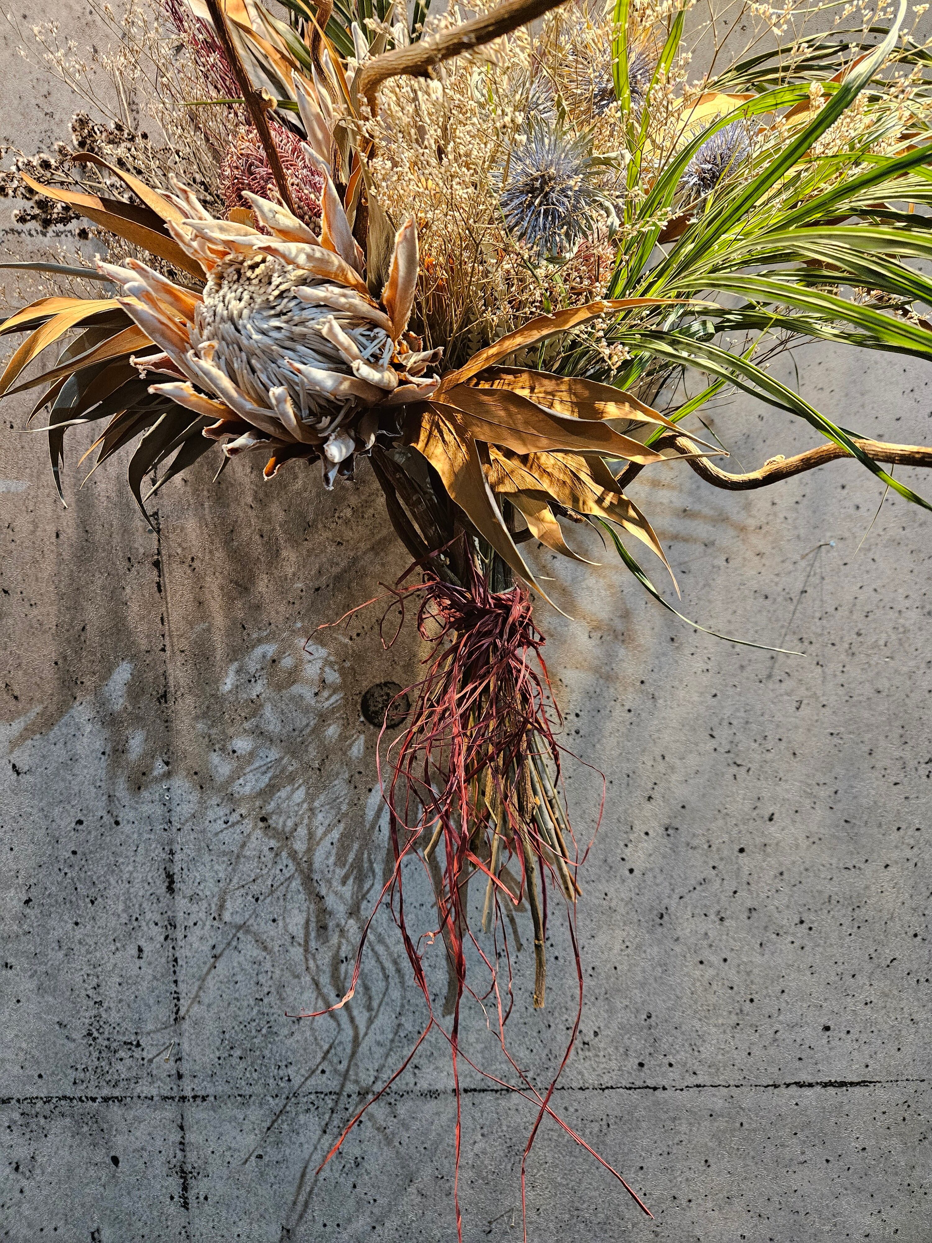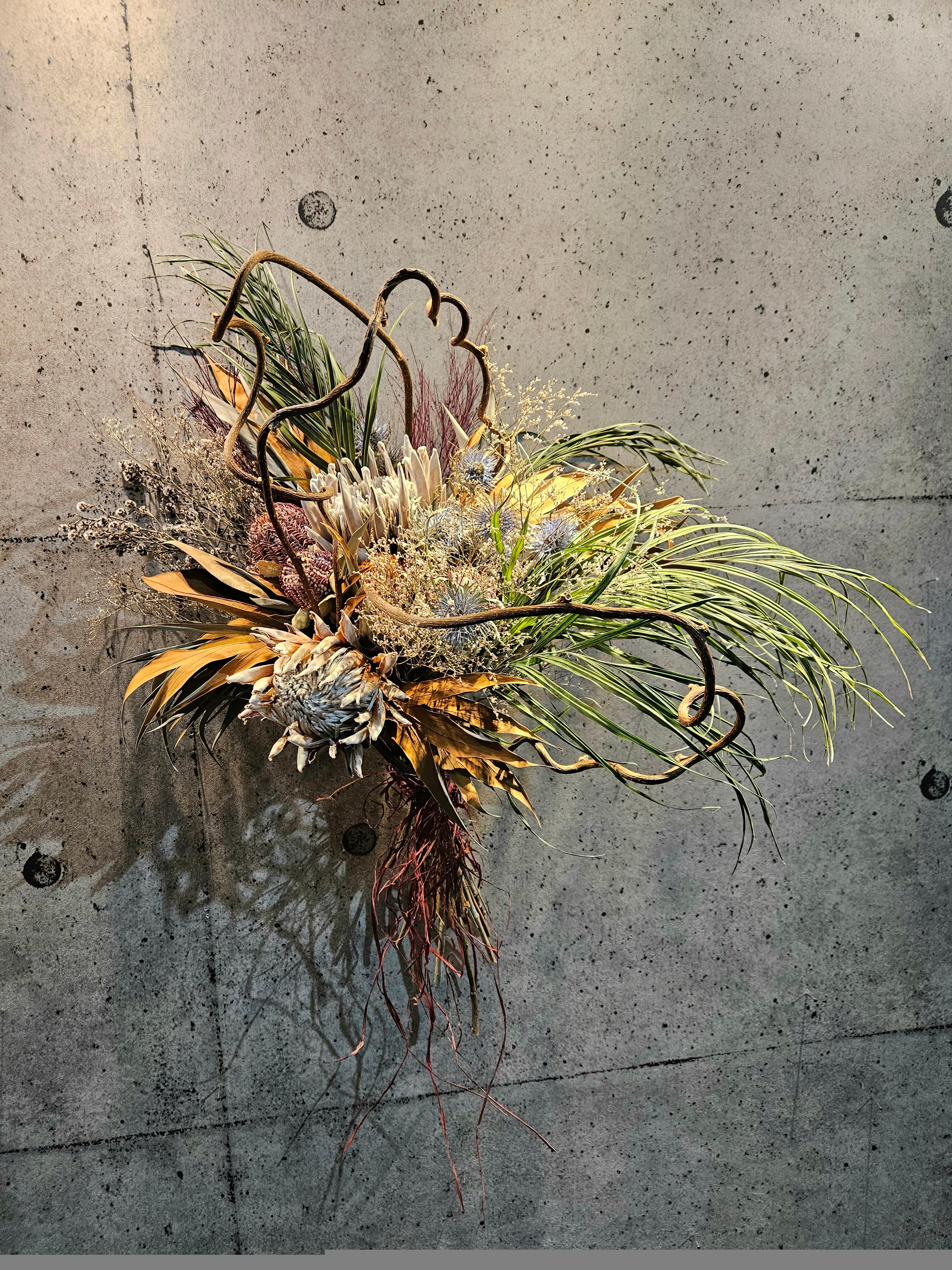 キングプロテア等のシャープな花材のデザインが印象的です。